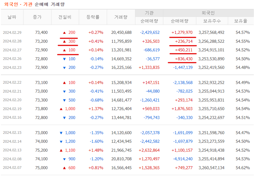 삼성전자의 기관가 외국인의 순매매 거래량이다. 외국인들이 대거 3일 양거래가 들어왔다. 이와 반대로 기관은 순매도를 이어갔다. 삼성전자의 좋은 소식이 있다는 예감이 몰려온다. 저항대도 얇아 긍정적 뉴스에도 크게 반응할 것이라는 기대감이 높다.