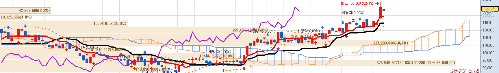 72000원 ~ 75000원의 박스권을 형성해 박스권을 뚫으면 77000원대에 매물대가 있어 77000원을 뚫어야 최근 전고점인 79000원을 뚫을 수 있을 것으로 보여진다.