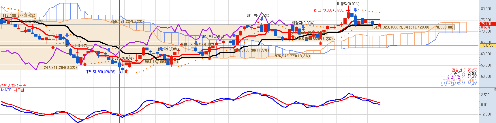 주봉에서 보면 아직 박스권에 있는것이 보인다. 74000원에 옹기종기 모여 있어서 큰 트래킹도 없이 계속해서 지지부진하고 있는 것을 볼 수 있다. MACD 보조지표를 보면 하향했다 상승하려는 모양새를 보여주고 있는데, 아직 이렇다 할 긍정적인 뉴스가 없어서 판단하기 이르다. 긍정적인 뉴스가 나온다고 한다면 MACD상에서도 우상향으로 바뀌겠지만 구름대의 저항선들을 쉽게 뚫기는 어려워 보인다. 고무적인 모습은 현재 저점을 다지고 있는 것처럼 보이기 때문에 싲간적으로 4월에는 우상향 신호가 나오지 않을까 한다. 조금 더 지켜보면 삼성의 주가 추세의 전환을 알 수 있을 것으로 보인다. 또한 기관이나 외인이 개미물량을 받아내지 않는다면 쉽게 올라가기는 어려워 보인다.