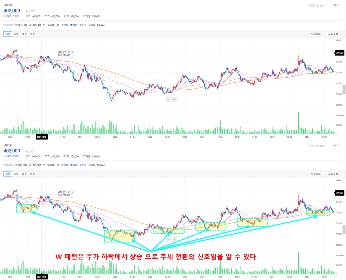 반대로 더블 바텀은 주가가 두번의 저점을 형성하고, 두 저점 사이의 고점에서 추가적 상승을 하는 패턴을 말한다. 더블 바텀 패턴은 하락 추세가 마무리되고 상승 추세로 전환 된다는 신호로 해석될 수 있다. 더블 바텀 패턴은 W 패턴으로 불리기도 하는데, W의 뒤집힌 봉우리의 크기가 서로 비슷하다는데 초점을 맞춘다. 이런 W 패턴은 주가가 중간 고점을 돌파하여 상승한다는 주가 하락세에서 상승세 전환을 한다 신호이기도 하기 때문에, 더블 바텀 패턴은 주가가 최저점에 형성 되었다는 것을 알 수 있는 주가패턴이다.