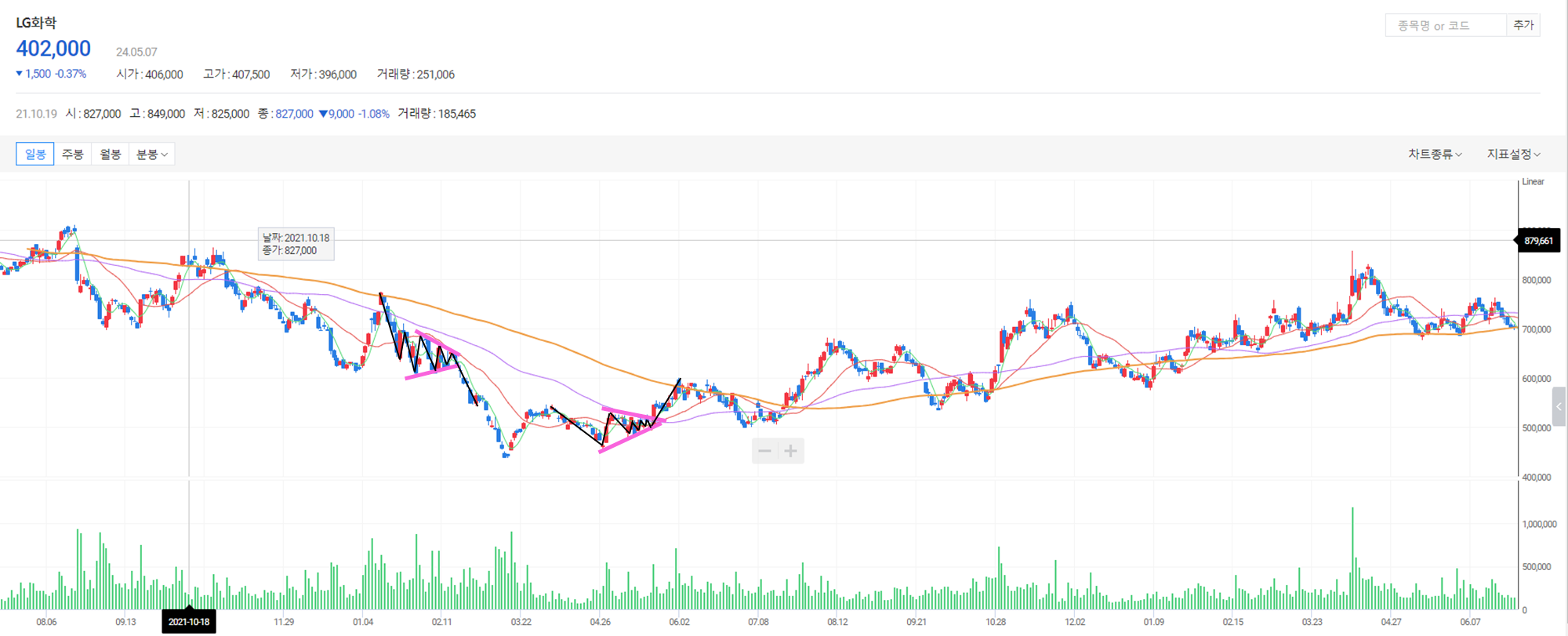 일봉에서는 주식의 낙폭이 생기는 부분에서 발생하거나 상승 하는 추세에서 큰 폭으로 오르고 난 후 기간조정을 거치는 부분에서 발생하게되는 경우가 많다. 다음은 LG 화학의 일봉에서 알아보자.