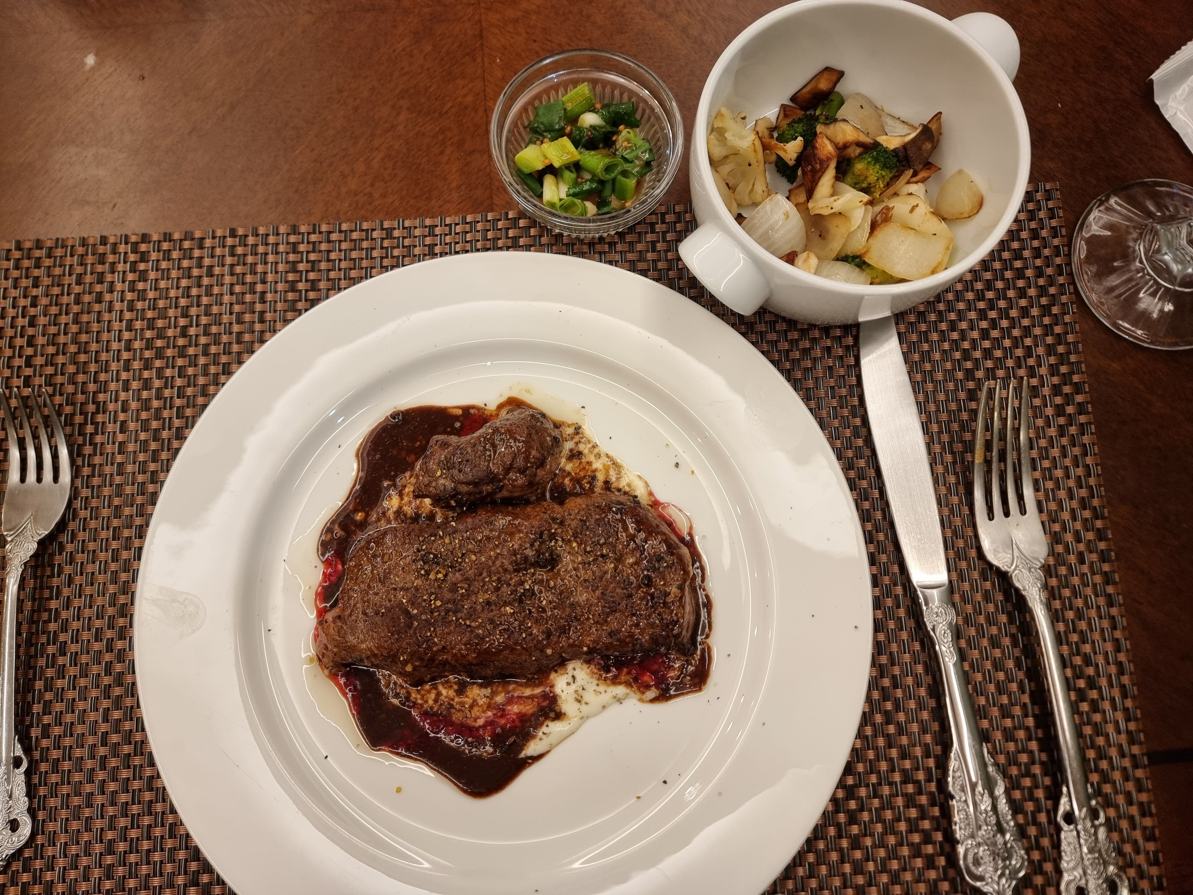 드디어 기다리고 기다리던 한우 스테이크가 등장했습니다! 겉은 먹음직스럽게 구워져 윤기가 흐르고, 칼을 대는 순간 부드럽게 잘리는 촉감에서부터 완벽한 굽기를 예상할 수 있었었어요. 제가 주문한 미디엄 굽기는 겉은 바삭하고 속은 촉촉하여 풍부한 육즙과 한우 특유의 깊은 풍미를 그대로 느낄 수 있었죠. 굽기는 미듐으로... 저는 핏물을 싫어하니깐요 ㅎㅎㅎ