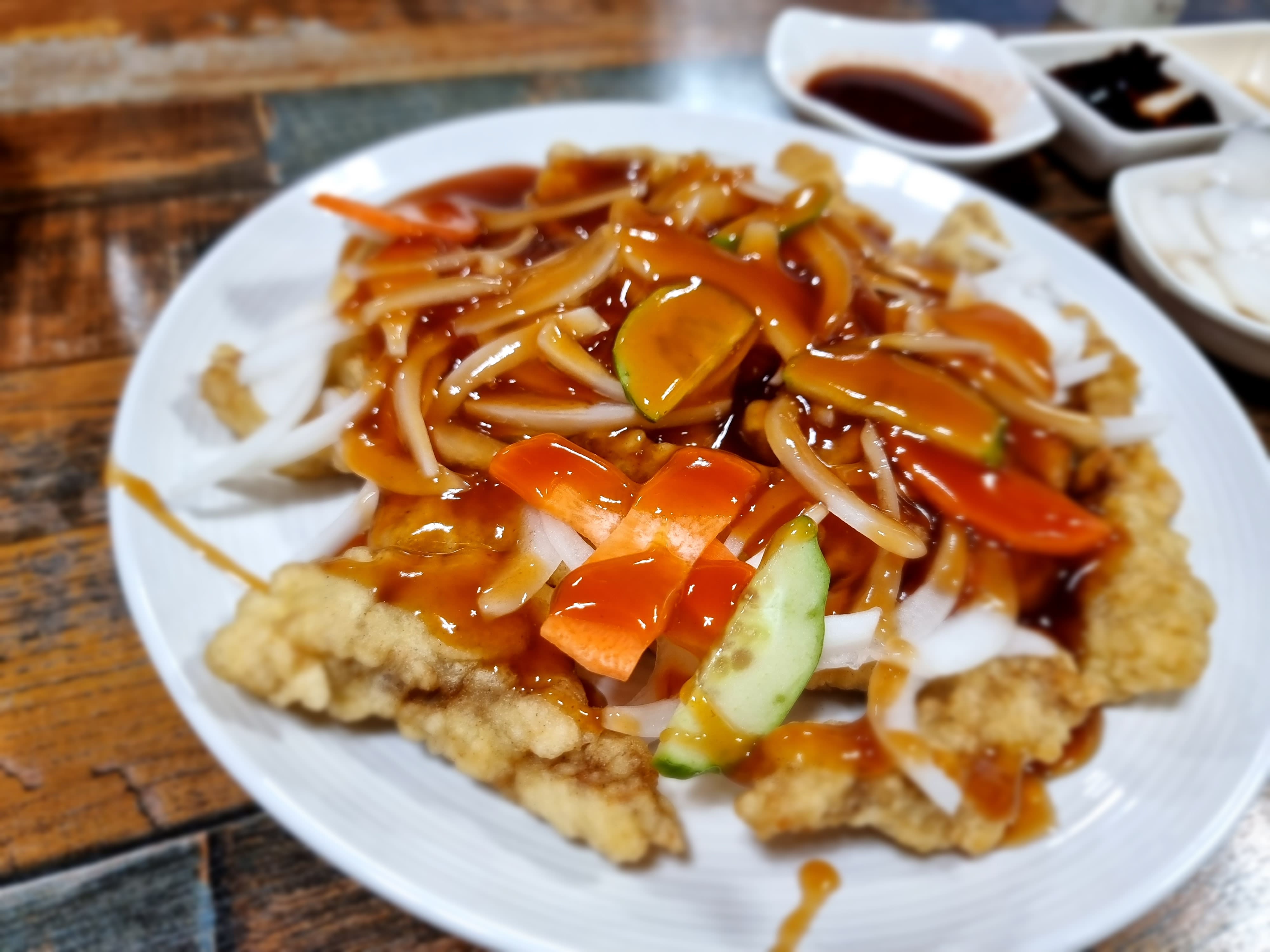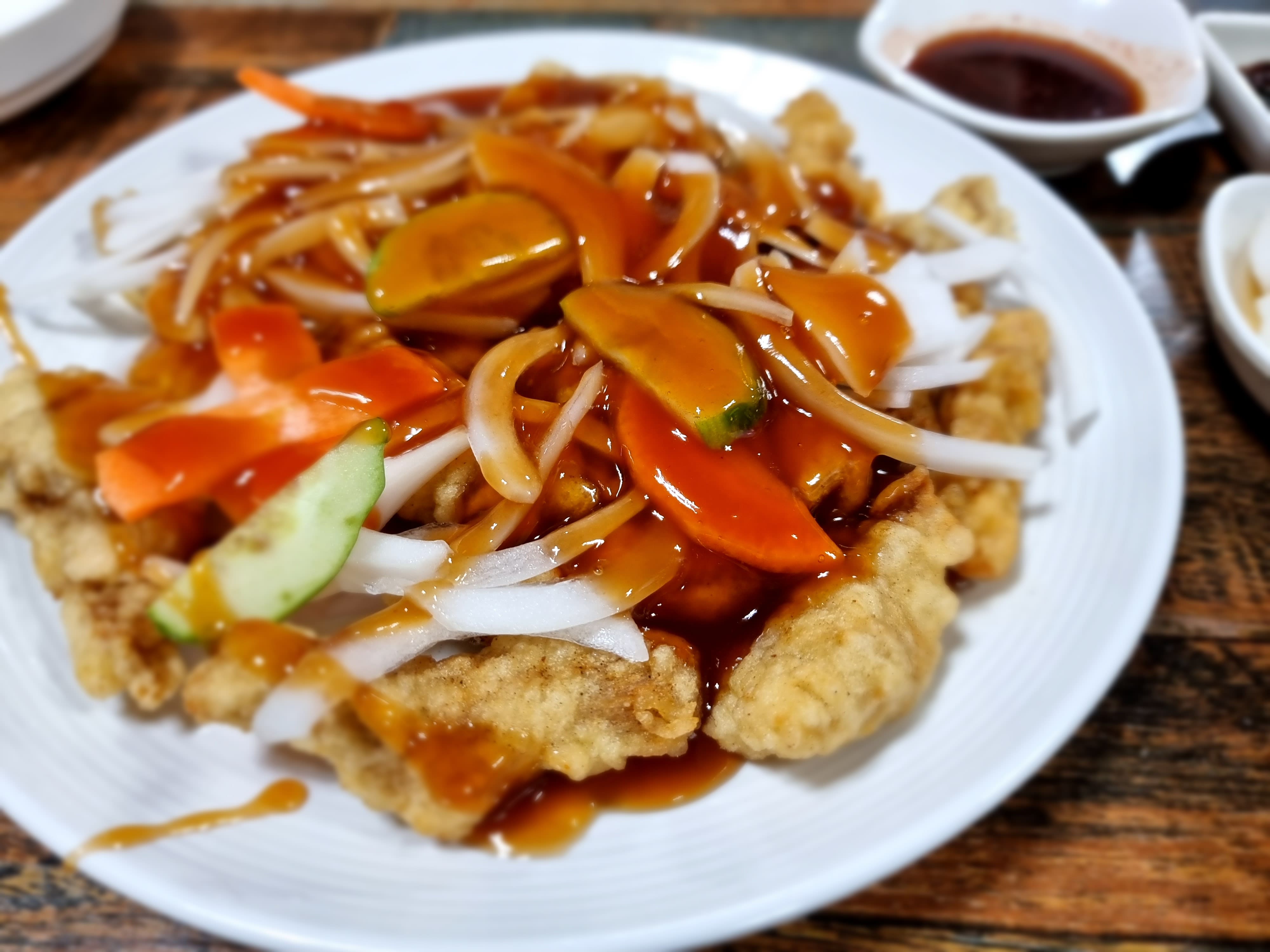 이미 짜장과 짬뽕으로 미각 포텐이 터진 상태였지만, 중식의 화룡점정, 탕수육을 빼놓을 순 없죠! "이모님, 여기 탕수육 소(小)자 하나 추가요!" (네, 제 위장은 우주입니다…??) 잠시 후, 김이 모락모락 피어오르는 탕수육이 영롱한 자태를 드러냈습니다.