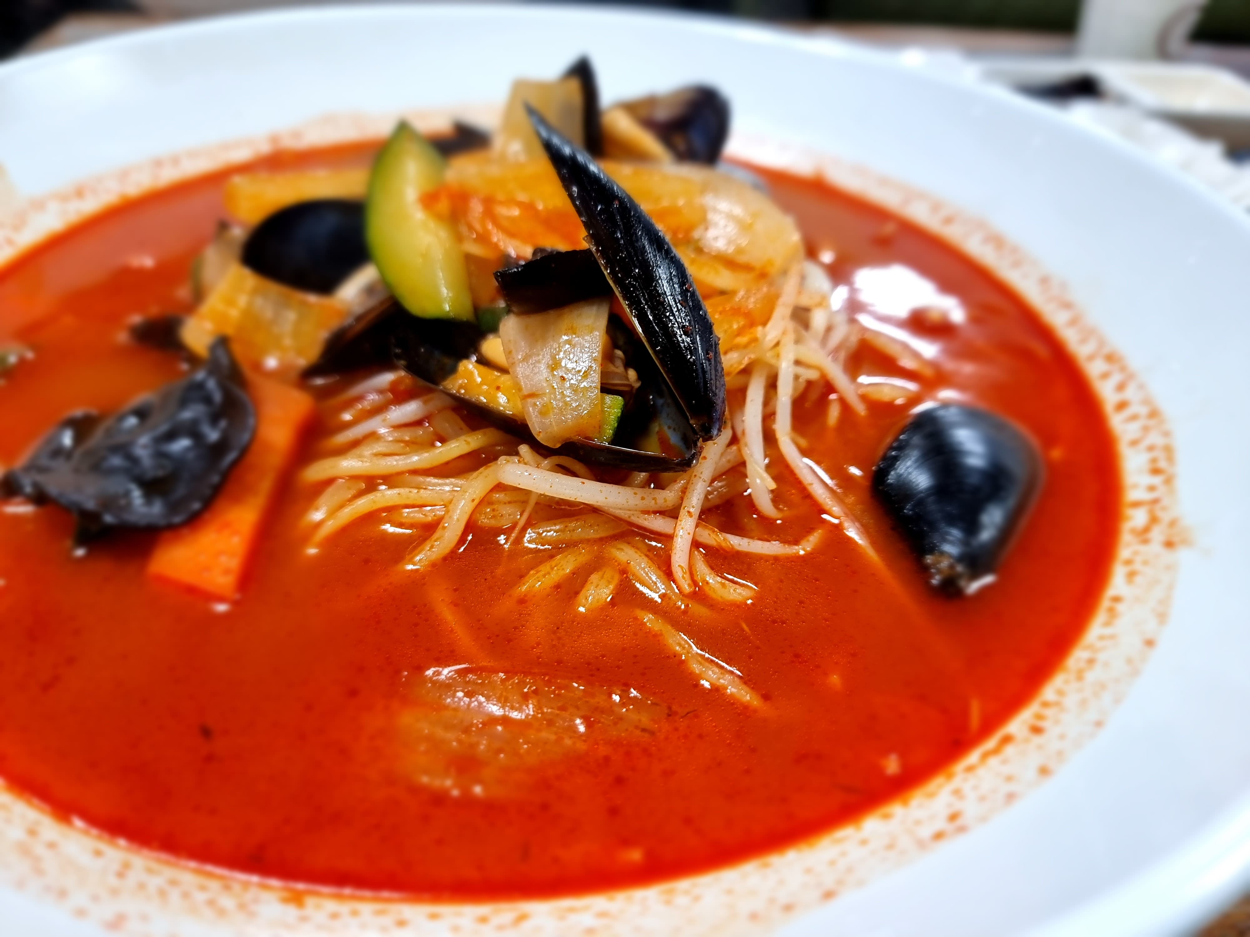 풍성하게 쌓아 올린 해산물과 채소들은 마치 '나 신선해요!'라고 온몸으로 외치는 듯 싱싱함을 뽐내고 있었죠. 국물부터 한 술 떠 입으로 가져가는 순간, 짜릿하게 퍼지는 칼칼하면서도 명쾌한 매운맛 뒤로, 묵직하면서도 시원한 해산물 육수의 깊은 풍미가 파도처럼 밀려옵니다.  국물 한 숟갈을 떠 먹어보니, 이건 그냥 매운 게 아니에요. 텁텁함이라고는 1도 찾아볼 수 없는, 아주 깔끔하고 개운한, 품격 있는 매운맛이랄까요? 마시면 마실수록 속이 확 풀리는 것이, 어젯밤 과음으로 고생하던 제 간(肝)에게 심심한 위로를 건네는 듯했습니다. (어제 안 마셨는데도 해장되는 기분!)