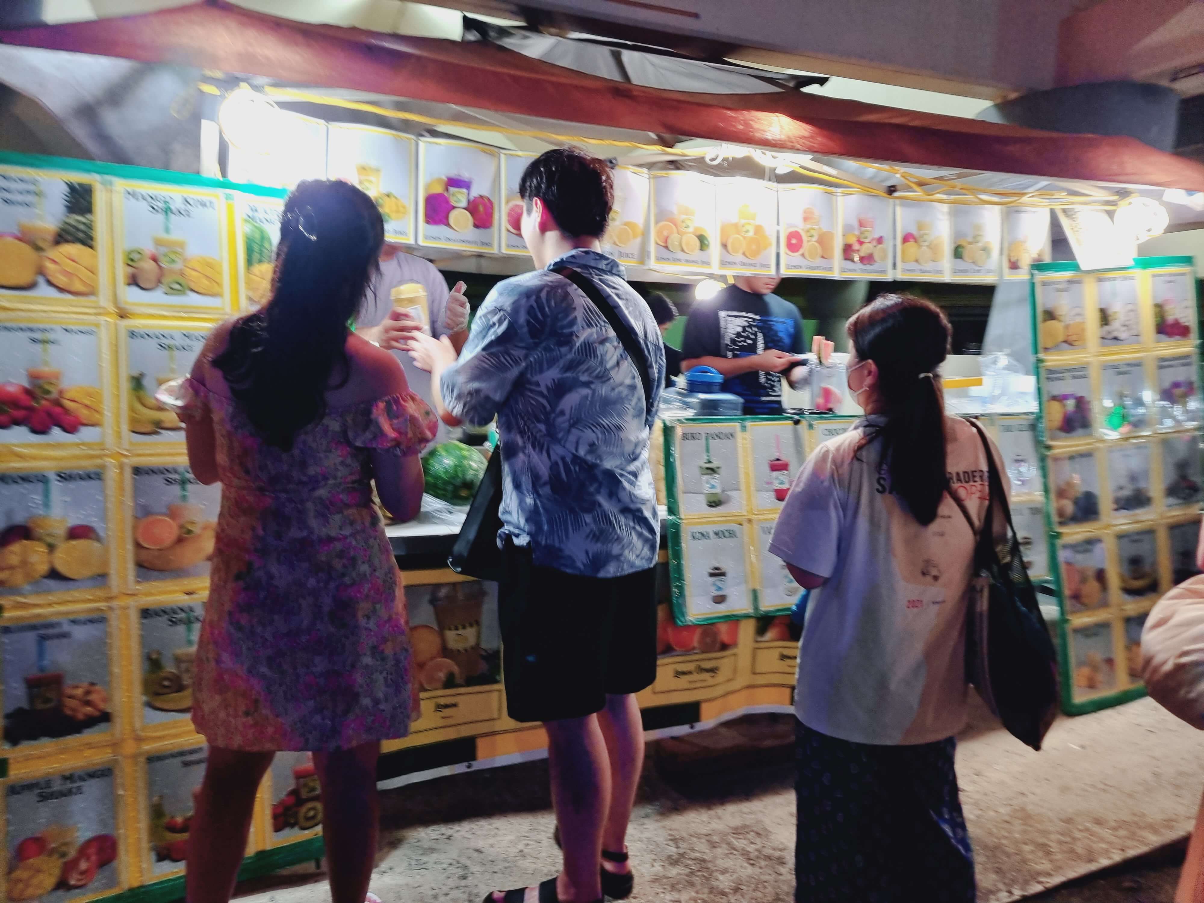야시장의 또 다른 장점은 사람들이 망고주스를 그렇게 사먹는다는 것이다. 옆에서 보고 있으니, 망고와 깔라만시, 그리고 망고시럽을 믹서에 넣고 갈고 곱게 간다음 다시 얼음을 주스통에 들고나와 믹서기에 얼음과 망고주스를 섞어 슬러시를 만든다음 손님에게 건낸다. 이 슬러시를 먹기위해 줄이 돌고 돌고 또 돌아 다른 음식점 앞에까지 줄이 이어지는 기이한 행렬들을 볼 수 있었다. 날씨가 더운 탓인가? 야시장에 방문한 손님들이 끊임없이 주스를 사먹는 모습이 인상 깊었다.