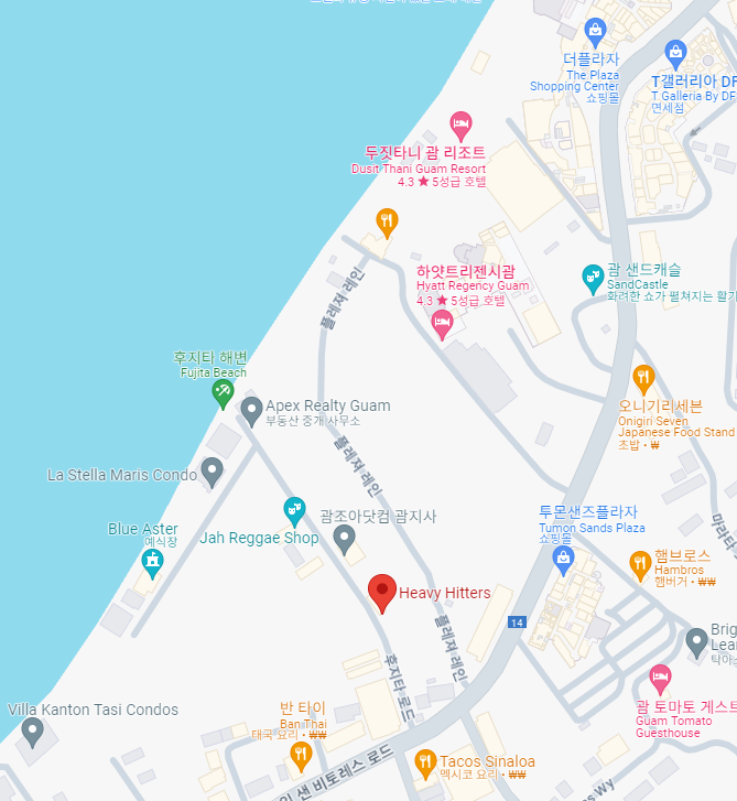 괌 시내에서 조금 떨어져 있는 곳이었다. 두짓비치에서부터 걸어가기엔 조금 멀게 느껴질 수도 있는 거리였지만 걸어서 20분 남짓 걸렸었다. 해비히터스 방향으로 가다 보면 상업거리가 아니라서 동네가 나온다. 뜨거운 낮에 일을 하는 인부들도 만날 수 있고, 심심찮게 찾아오는 한국인과 중국인들을 만나 수 있다.