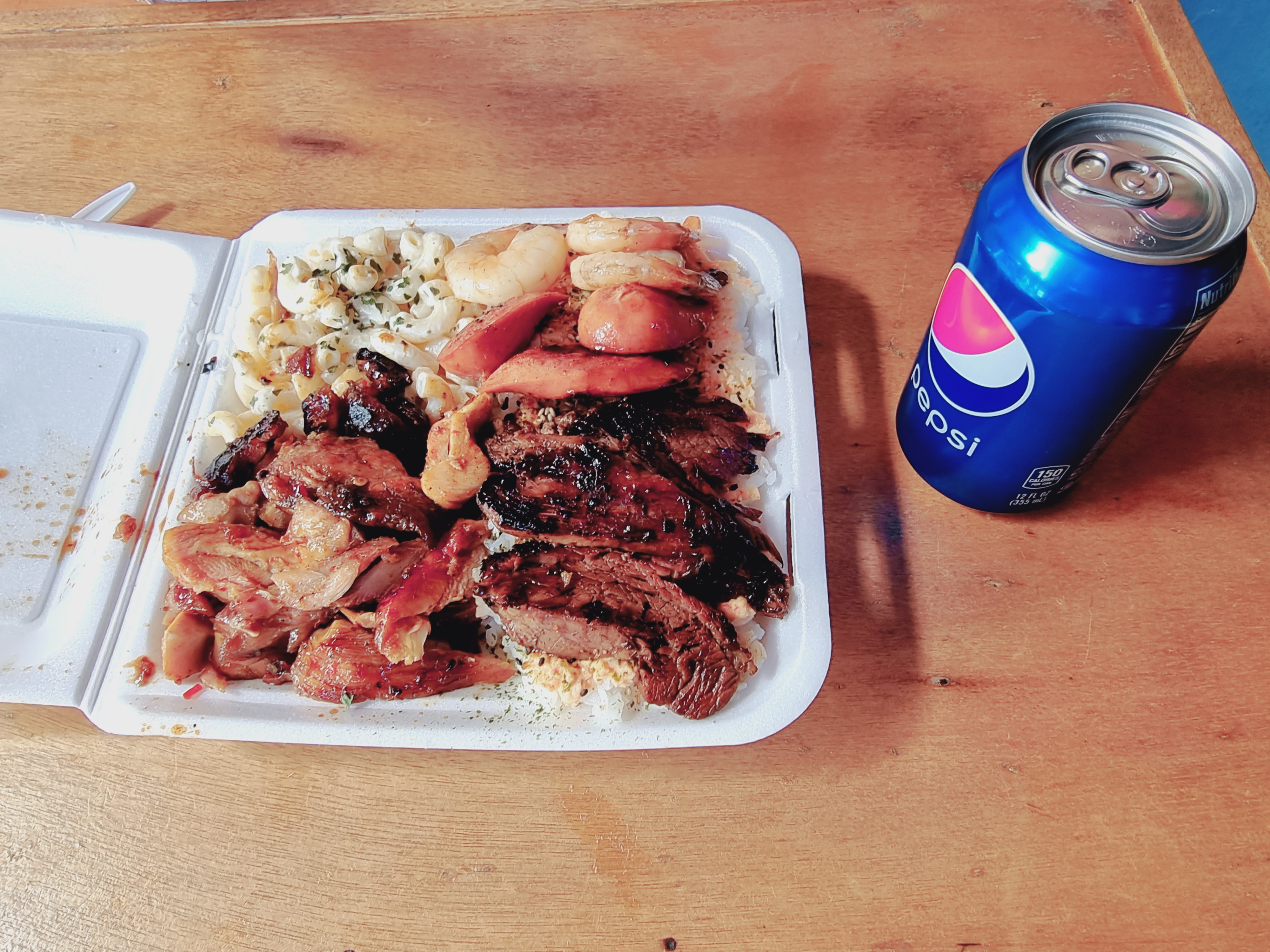 MAGALAHI (마가라히) 를 주문했다. 마가라히는 스테이크와 쉬림프, 초밥라이스, 계란 등이 포함되어 있는 그릴과 철판의 조화를 이룬 도시락 같은 식사였다. One dish로 판매하는 것을 플라스틱 그릇에 담아서 판매하였다. 필자는 2인분을 시킬 것을 달랑 저 메뉴 한 개만 주문하였다. 옆에서 봤는데... 양이... 양이... 상당하였다. 성인남성 2명이서 먹어도 되는 양이랄까. 일단 2인분에서 1인분으로 주문하였다. 1인분에 US $ 25. 거기에 콜라를 주문하면 US $ 30까지 올라간다. 길거리 음식에 US $30이니, 환율 계산하면 40500이다. 기본 레스토랑은 2인이서 US $50이니, 생각해 보면 저렴한 편에 생각한다.