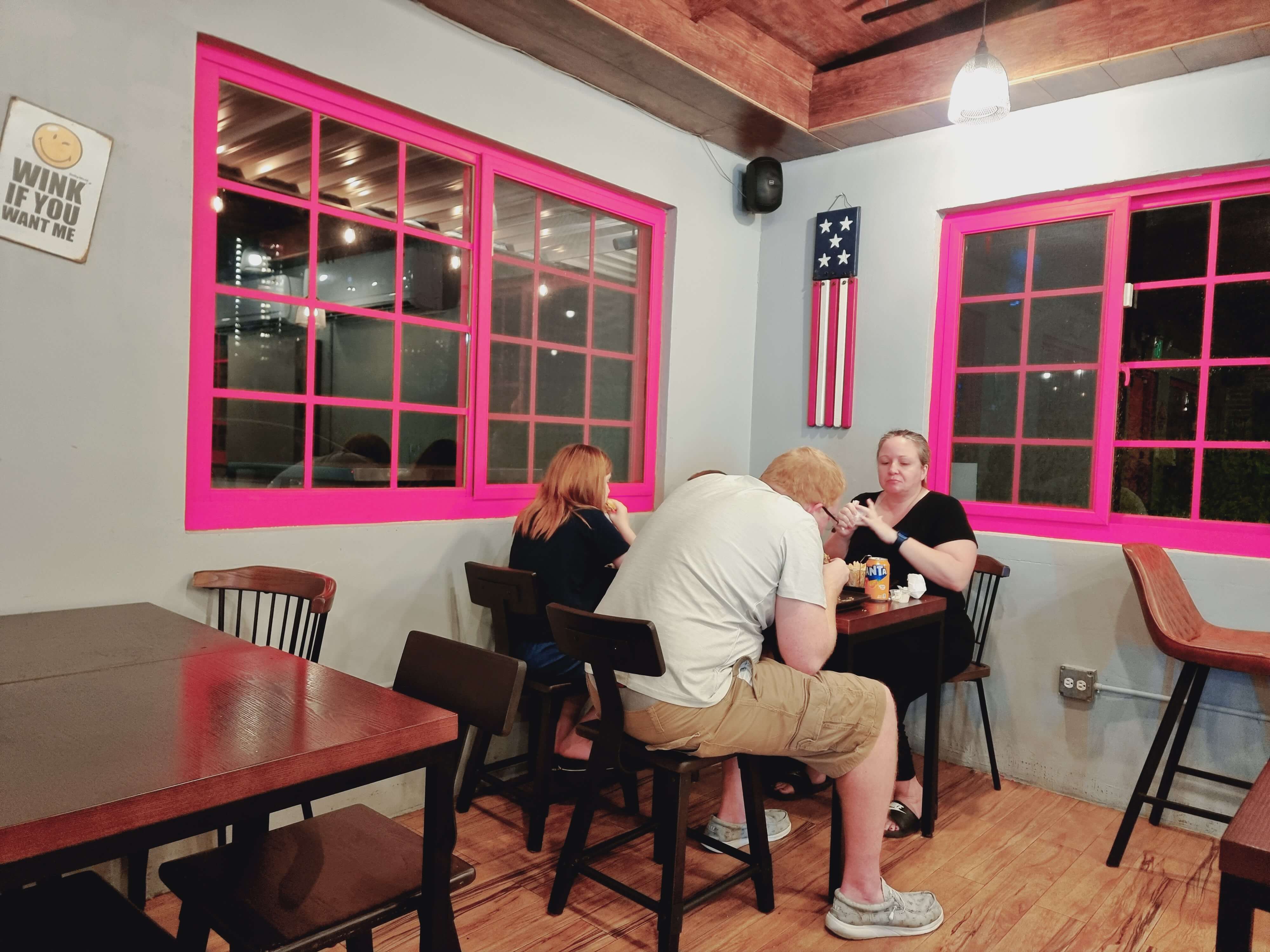 그 간판으로부터 조금 더 걸어가다 보면 아담한 집이 나오는데 그곳이 햄브로스 HAMBROS이다. 푸른색 벽색깔에 분홍색 문과 창이 있는 아담한 햄버거 집이 손님을 맞이한다. 앞쪽에는 넓은 주차장도 완비되어 있으니, 렌트를 하신 분들도 부담 없이 차를 갖고 햄브로스에 파킹을 하면 된다. 이미 현지인들 사이에서는 수제햄버거지만 맛집으로 이름이 알려져 있었다. 실내도 깨끗한 햄버거집. 괌에서도 가족들이랑 가볍게 식사를 위해서 HAMBROS 햄브로스에 들르는 것 같았다.