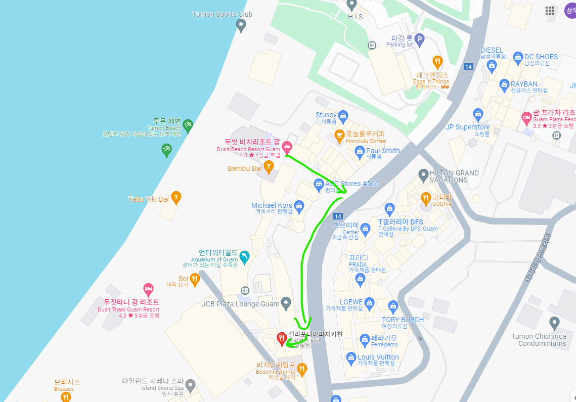 숙소가 dusit beach resort이고 주변이 시내 중심가에 위치해 있기 때문에, dusit beach resort를 중심으로 맛집을 찾기 시작했다. California Pizza Kitchen은 길가에서도 2층에 위치하고 있어서 줄을 섰는지, 가게가 붐비는지 잘 알지 못한다. 그리고 건물 외부에서 내부가 보이지 않기 때문에 들어가 봐야 알 수 있었다.