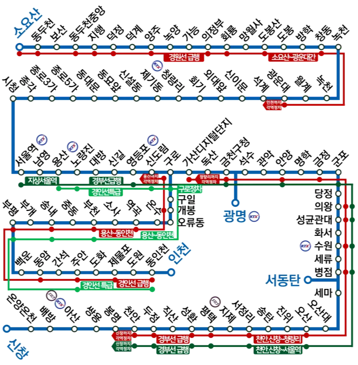 | 역 | 종착역 | 열차번호 | 신창 | 온양온천 | 배방 | 탕정 | 아산 | 쌍용 | 봉명 | 천안 | 두정 | 직산 | 성환 | 평택 | 지제 | 서정리 | 송탄 | 진위 | 오산 | 오산대 | 세마 | 병점 | 세류 | 수원 | 화서 | 성균관대 | 의왕 | 당정 | 군포 | 금정 | 명학 | 안양 | 관악 | 석수 | 금천구청 | 독산 | 가산디지털단지 | 구로 | 신도림 | 영등포 | 신길 | 대방 | 노량진 | 용산 | 남영 | 지하서울역 | 시청 | 종각 | 종로3가 | 종로5가 | 동대문 | 동묘앞 | 신설동 | 제기동 | 지하청량리 | 회기 | 외대앞 | 신이문 | 석계 | 광운대 |