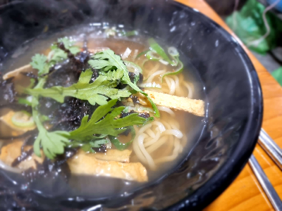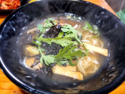 검은색 그릇에 담겨 나온 가락국수이었다. 준비시간도 꽤 걸린 것 같았다. 우동을 주문하고 반죽을 떼서 우동기계에 넣고 우동사리를 뽑아 다시 우동면을 삶아서 우동을 만드신다. 그리고 그릇에 삶은 우동면을 담고 그위에 육수를 부어 우동을 만들고, 어묵과 쑥갓과 김가루를 뿌려서 완성한다. 어떻게 보면 정말 간단한 조리처럼 보이지만 우동육수가 일본의 간장만 풀어서 만든 육수와 달랐다.