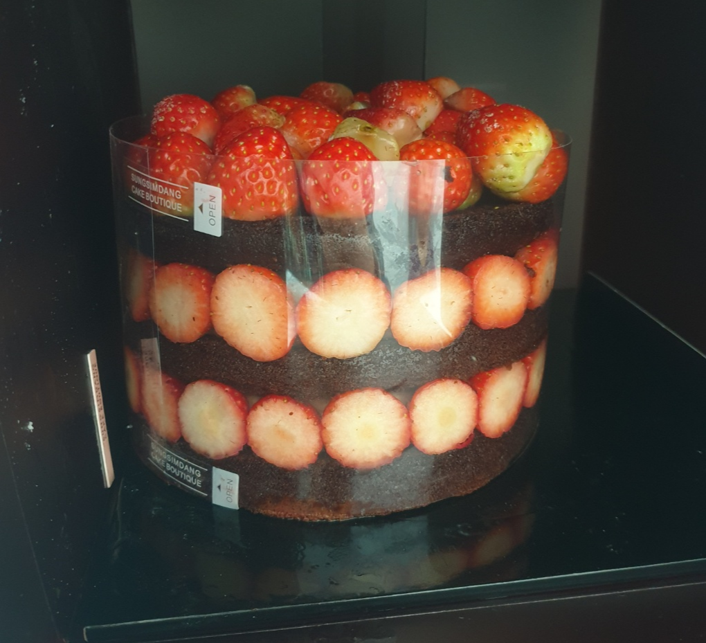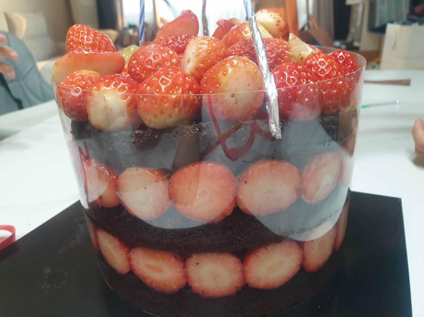 또한 떡시루처럼 모양을 내고 케잌의 빵은 초코브라우니로 만들었고, 초코브라우니안에 초코크림으로 단단하게 채워져 있었다. 또한 외벽으로 딸기 케잌을 둘러 딸기시루를 완성 하였다.
