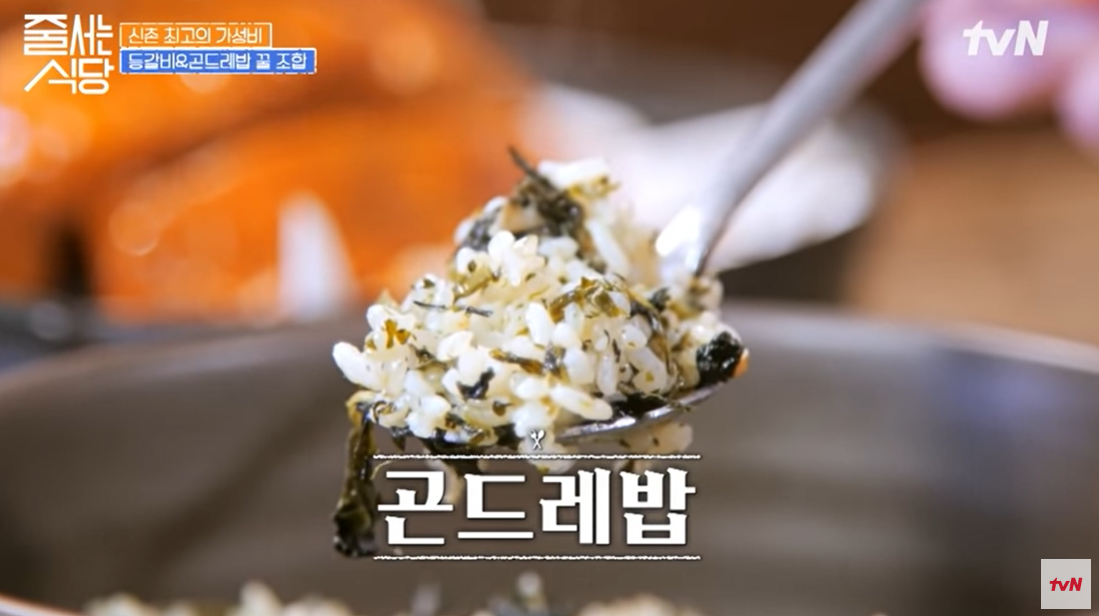 마지막으로 곤드레밥. 건강한 밥상으로 매운등갈비찜과 함께 먹으면 매운맛을 줄여주는 곤드레밥. 곤드레의 향도 좋아서 등갈비찜을 먹을 때 풍미를 더욱 좋게 만드는 음식이다.