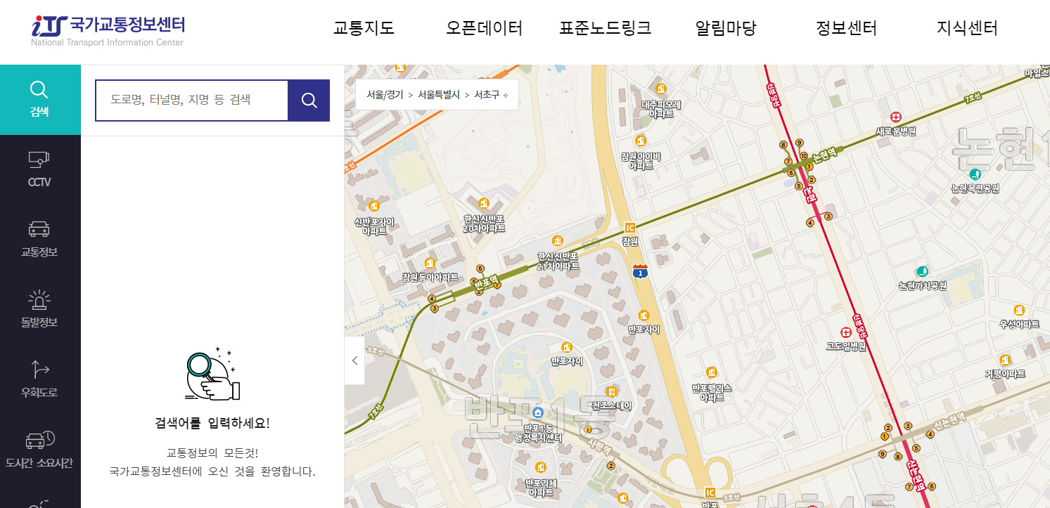 도로 실시간 상황을 확인하기 위해서 메인 페이지를 열면 검색과 CCTV, 교통정보 탭이 좌측에 보인다.