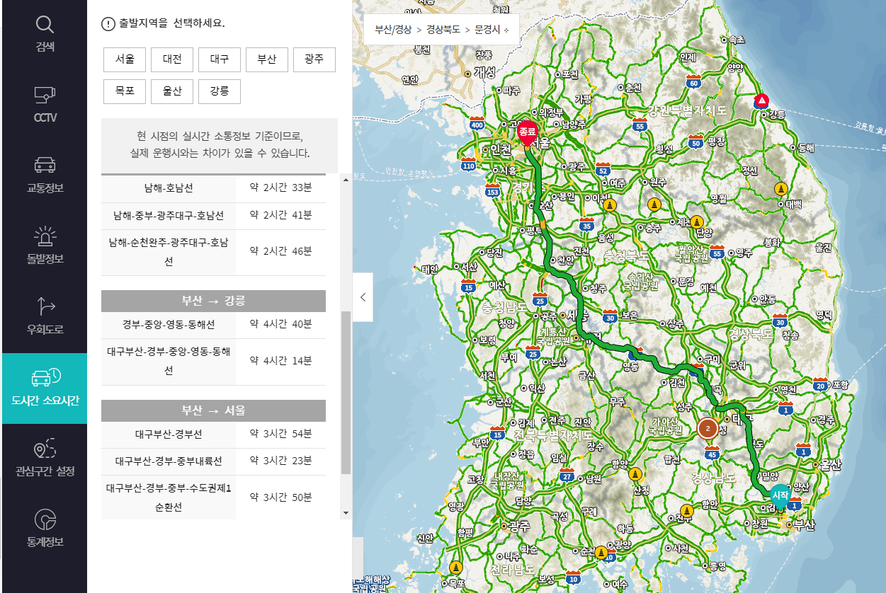마지막으로 도시간 소요시간탭이다. 도시와 도시를 클릭하면 전체 노선도와 어느구간이 정체구간인지를 알 수 있기때문에 귀성길이나 여행 갔다 올때 사용하면 매우 유용하다.
