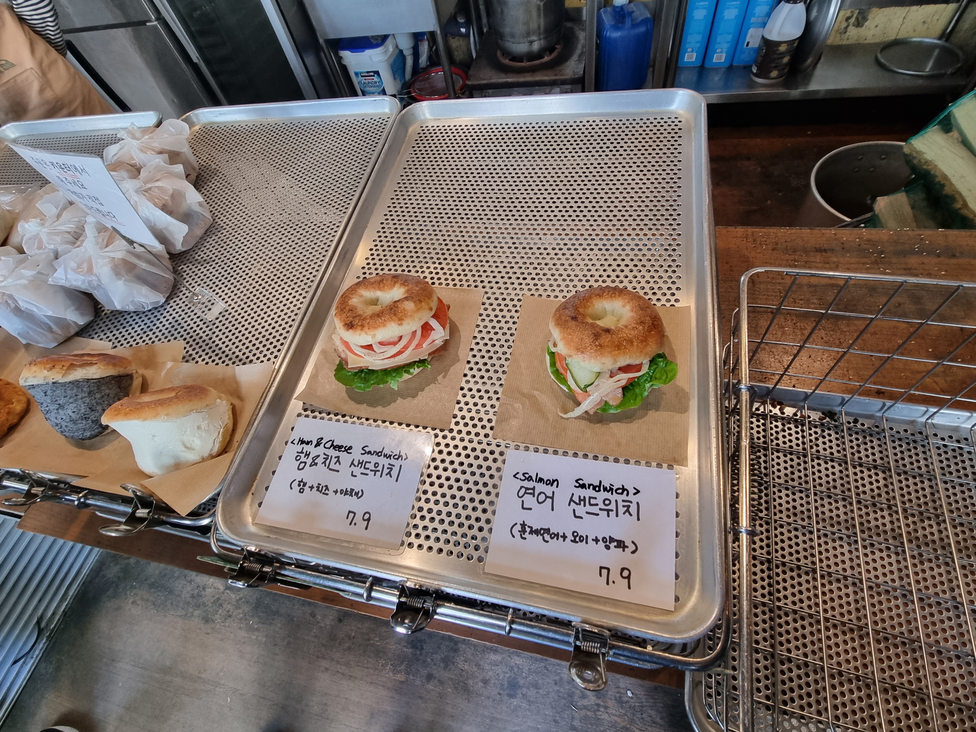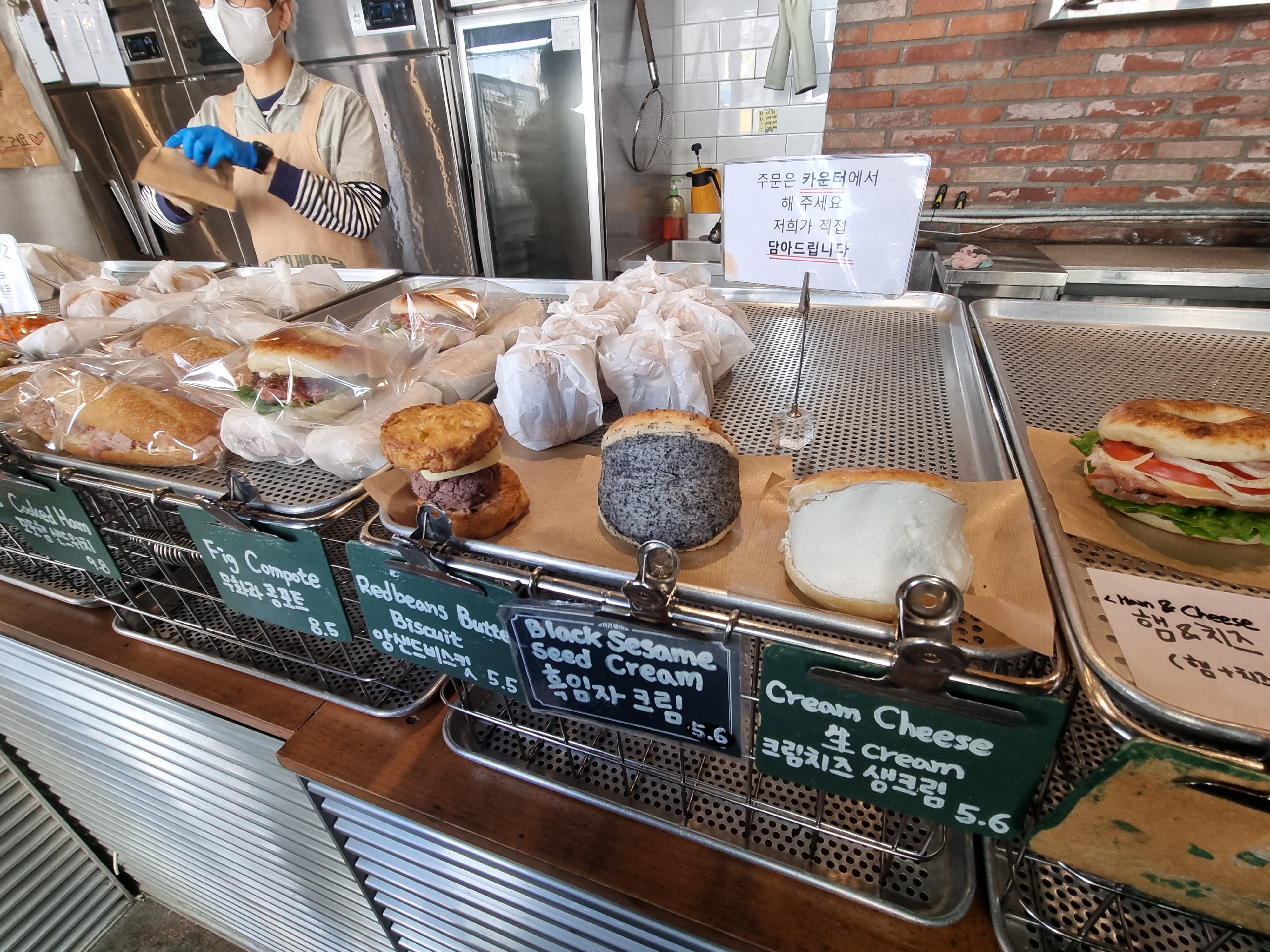 베이글이 뭐라고 30분만에 사고싶었던 베이글들이 동이날까 하는 생각에 오픈런은 못하고 점심에 방문하였다. 점심에는 다행이 사람들이 많이 없었다. 하지만 단점이 맛있는 베이글들은 벌써 다 팔리고 판매중단하고 있었다. 필자입장에서는 다양한 베이글을 한 번 씩 사서 맛을보고 싶은 마음이 굴뚝 같았으나, 베이글 가격이 만만치 않아 사서 먹는데 부담스러웠지만 그만큼 또 맛이 있었기에 먹으면서 과연 유명할 만 했다라는 생각이 들었다.