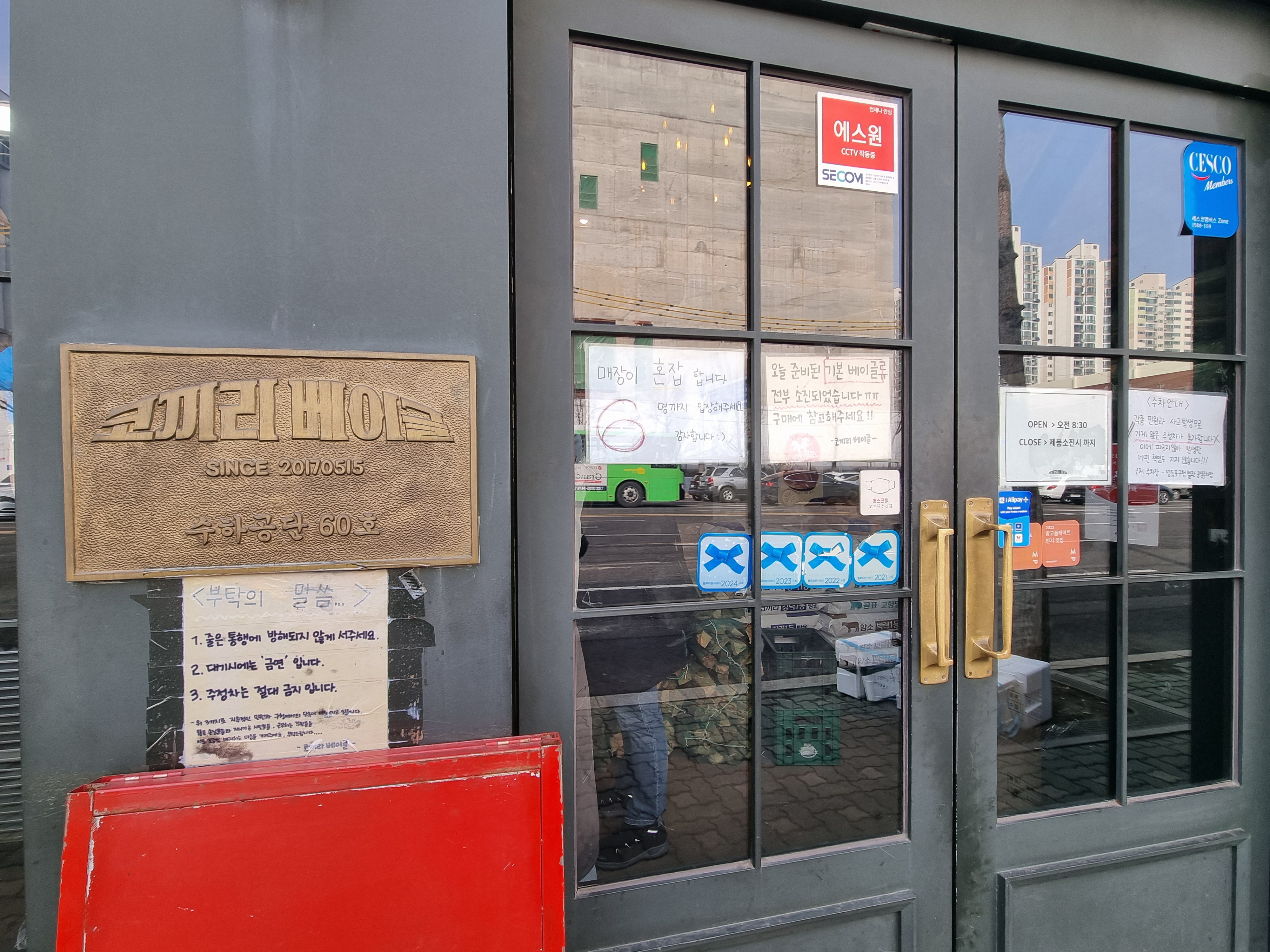 줄 서는 식당 2.에 소개된 코끼리베이글 앞에는 명패가 붙어있고, 베이글 전문점이 베이글을 만들고 있거나 준비중이면 닫혀있다는 알림판을 만들어 세워놓는다. 코끼리베이글 안이 매우 협소하여 많은 손님들이 들어오는것은 조금은 힘들고, 입장가능한 손님을 6명으로 제한을 두었다. 그리고 모든 베이글을 화덕에서 굽게되서 갯수제한을 두었다는 알림글들이 붙어 있었다.