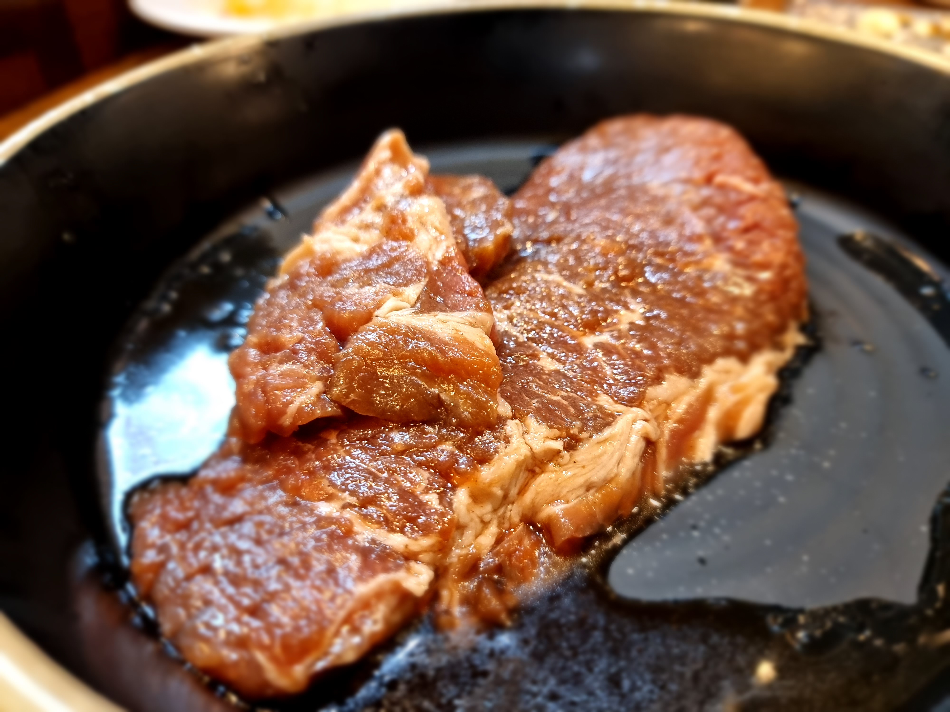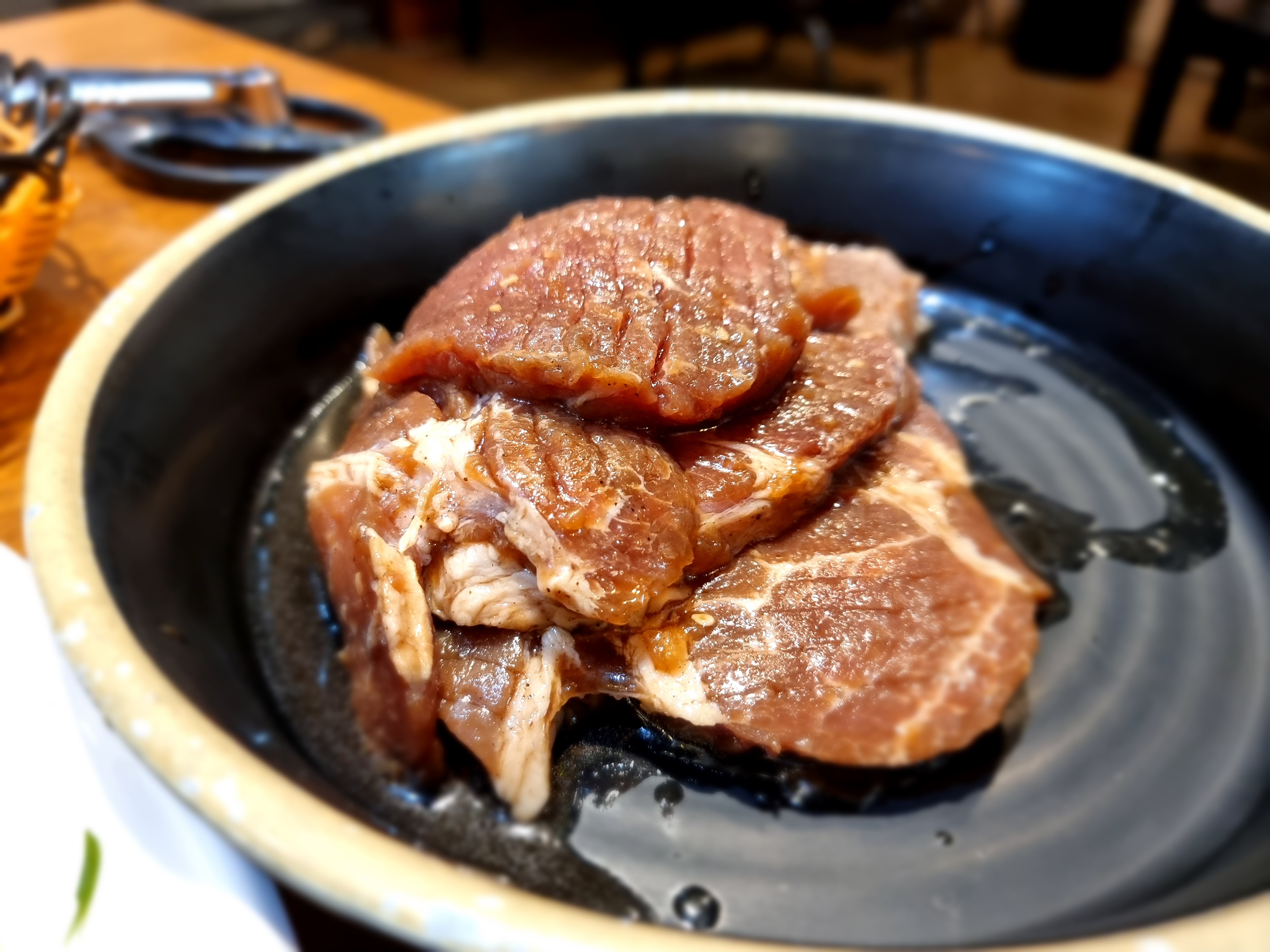기본 찬이 세팅되고 고기가 나왔다. 돼지고기가 꽤 신선했었고, 양념에 절여져 있어서 고기의 색이 갈색을 띄는것 처럼 보이지만 그림자에 의해서 그렇게 보인 것 같았다. 돼지갈비가 저온숙성이 되었는지 질기지는 않았다.