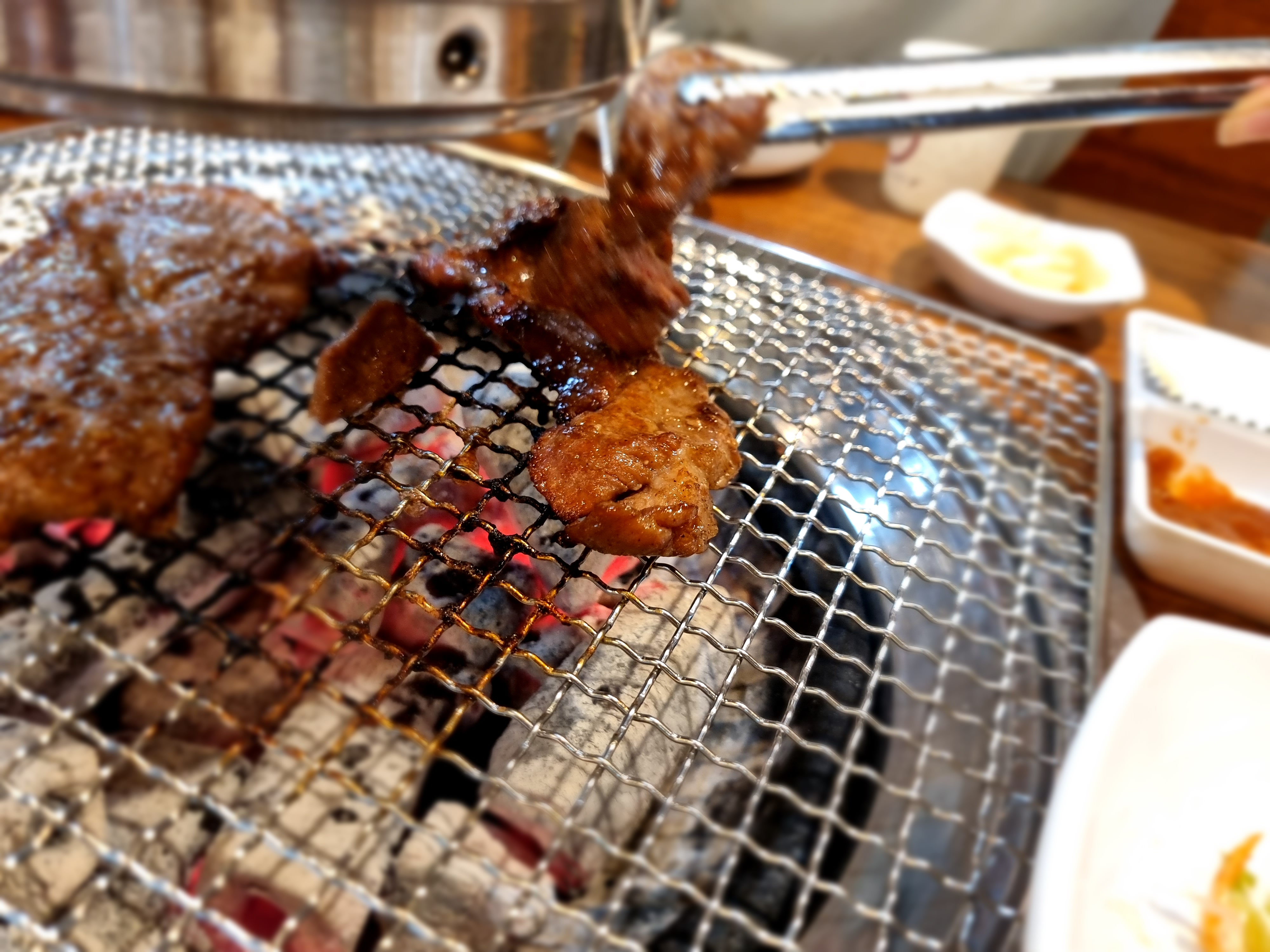 고기를 석쇠에 올리고 굽기시작했다. 양념되지갈비라 구울수록 맛있는 냄새가 올라왔다. 숯불에다 직접 구우니 숯불에서 올라오는 열기로 인해서 얼굴이 뜨거웠었지만 그만큼 고기가 빨리 익었다.