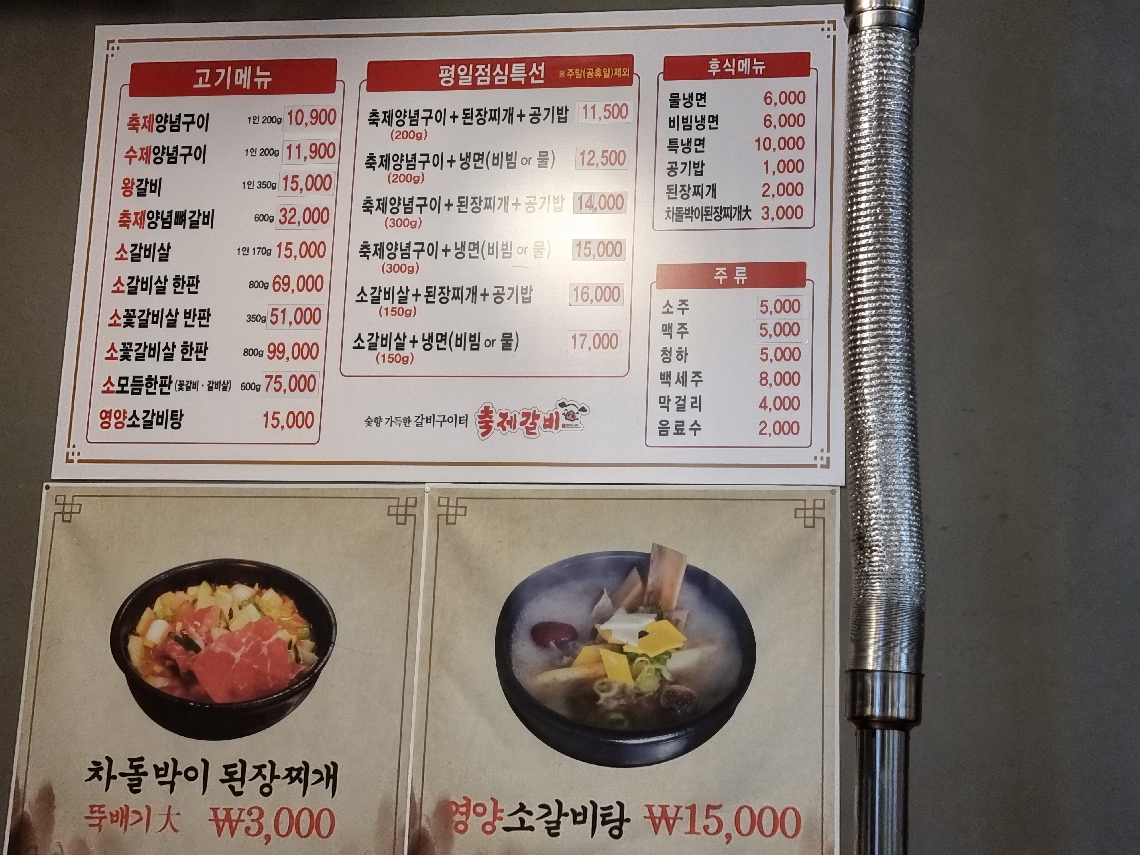 축제갈비를 주문을 했다.  축제갈비에 들어가는 고기의 신선도가 꽤 좋았었던 것 같았다. 돼지고기라 신선하지 않으면 누린내가 올라오는데 빛깔부터 신선해서 맛있어 보였다. 고기메뉴는 축제양념구이, 수제양념구이, 왕갈비, 축제양념뼈갈비, 소갈빗살, 소갈빗살한판 등 다양한 고기메뉴가 준비되어 있었고, 평일점심특선은 축제양념구이와 된장찌개를 한 세트로 제공되고 있었다. 축제갈비의 음식을 먹어보니 제일 맛있는 것은 된장찌개였다. 차돌박이 된장찌개로 된장찌개 안에 차돌이 들어가 있어서 된장찌개가 구수한 맛이 일품이었다.