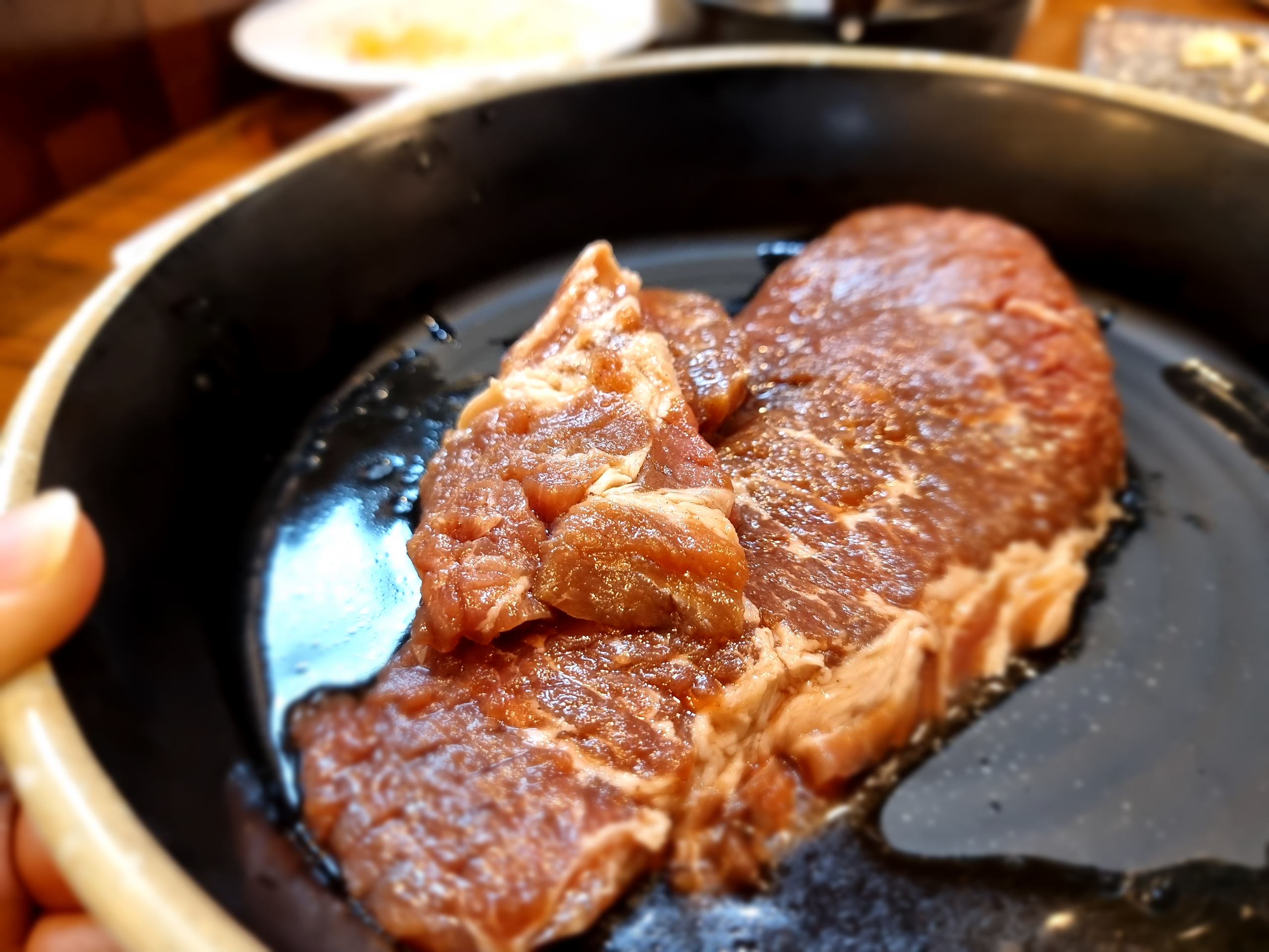 기본 찬이 세팅되고 고기가 나왔다. 돼지고기가 꽤 신선했었고, 양념에 절여져 있어서 고기의 색이 갈색을 띄는것 처럼 보이지만 그림자에 의해서 그렇게 보인 것 같았다. 돼지갈비가 저온숙성이 되었는지 질기지는 않았다.