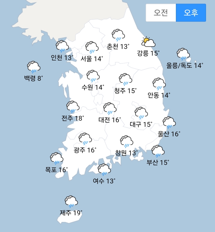 일요일은 봄 비가 내릴것으로 예상 됩니다. 전국이 15도 안팎으로 따뜻한 봄 날씨가 계속 되겠지만, 교통길 안전 주의하시기 바랍니다.