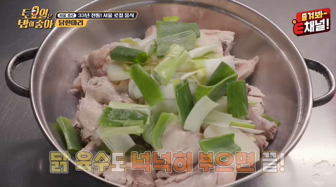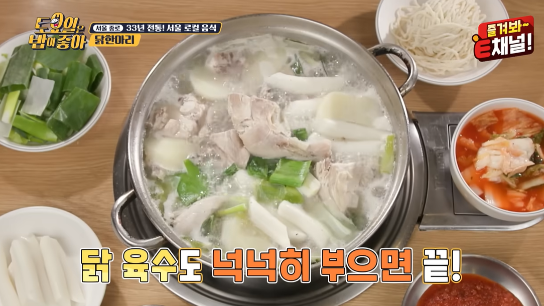 1인 1닭 하는 토밥츠가 닭 한 마리 메뉴를 먹으면서 하는 말이 닭육수에 닭다리를 푹 삶은 후 먹게 되면 부드러운 식감이 일품이라고 한다. 음식을 먹다 보면 김치를 많이 먹게 되는데, 김치가 떨어질 때즈음 김치를 채워 준다. 손님 응대가 상당히 빠른 편인 것 같다. 기본적으로 사리를 추가할 때 떡, 감자, 대파가 들어있는데, 떡사리를 추천한다고 한다. 국수사리도 추가해서 칼국수처럼 먹어도 된다. 양념에 올려서 국수를 먹으면 또 그 맛이 새롭다.
