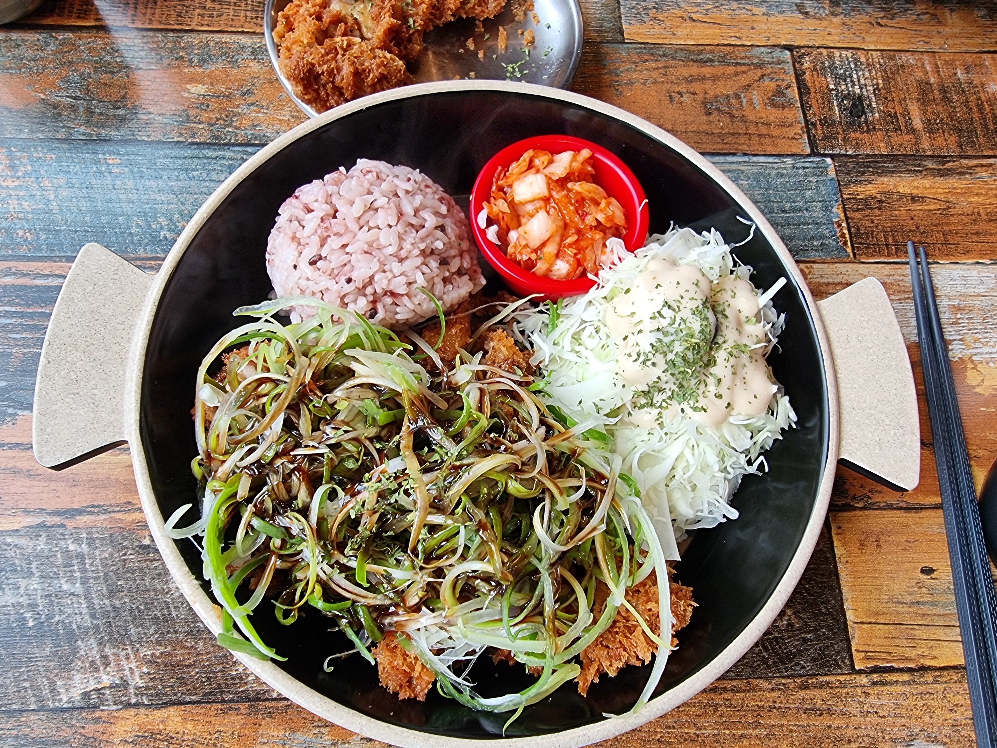 저는 파닭통닭다리까스를 주문했어요. 주위에서 먹어본 동료들의 의견을 십분 참조해서 주문한 결과였는데, 파닭 통닭다리가스는 바삭한 통닭다리살을 얇은 파채와 같이 함께 먹을 수 있도록 한 음식이었어요. 쌀밥은 흑미밥으로 나왔었고, 양파샐러드와 파절이가 같이 나왔어요. 일부 김치도 조금 나왔었고요. 그리고 파닭 통닭다리가스도 파채 밑에 깔려 나왔죠.