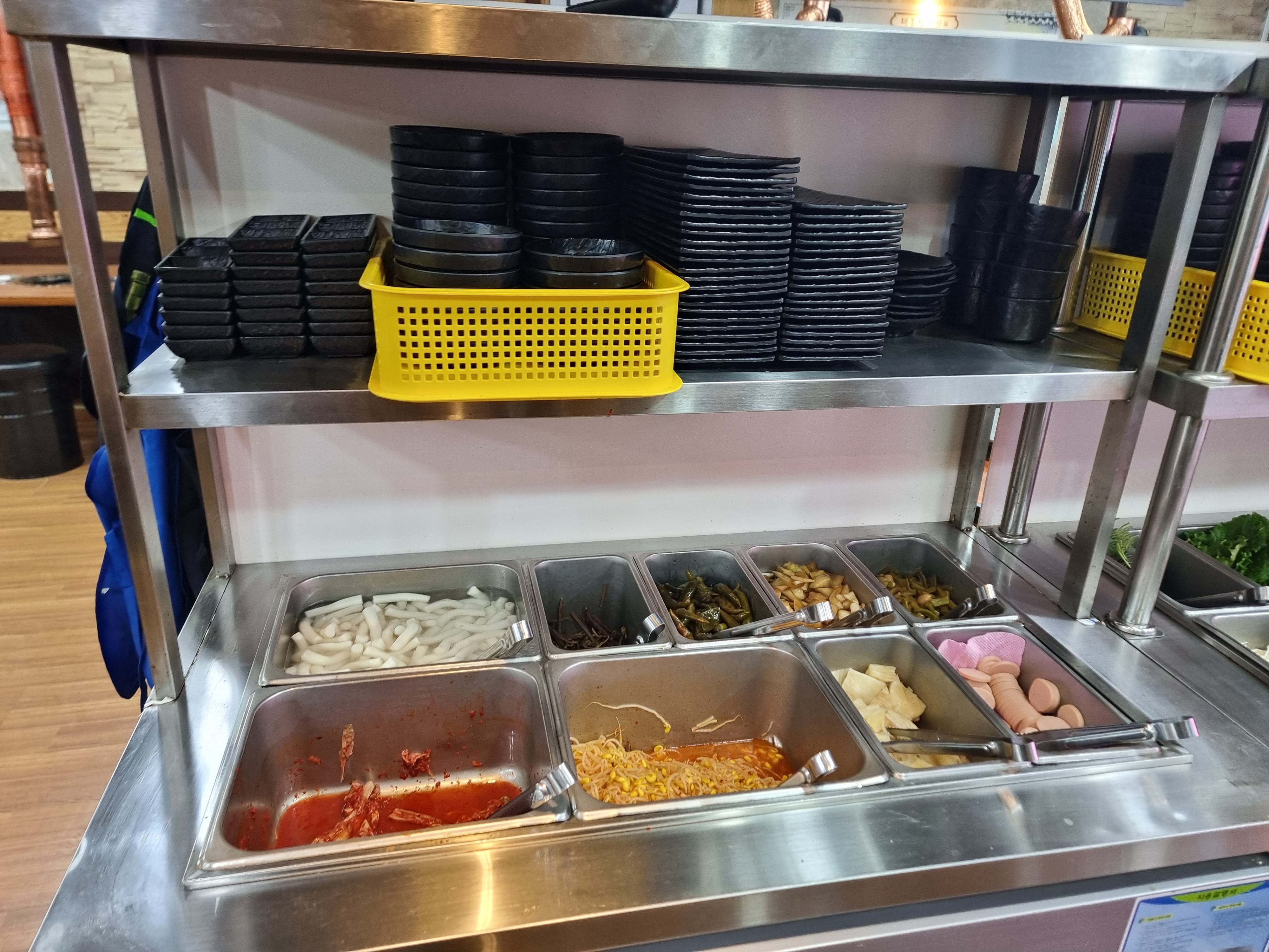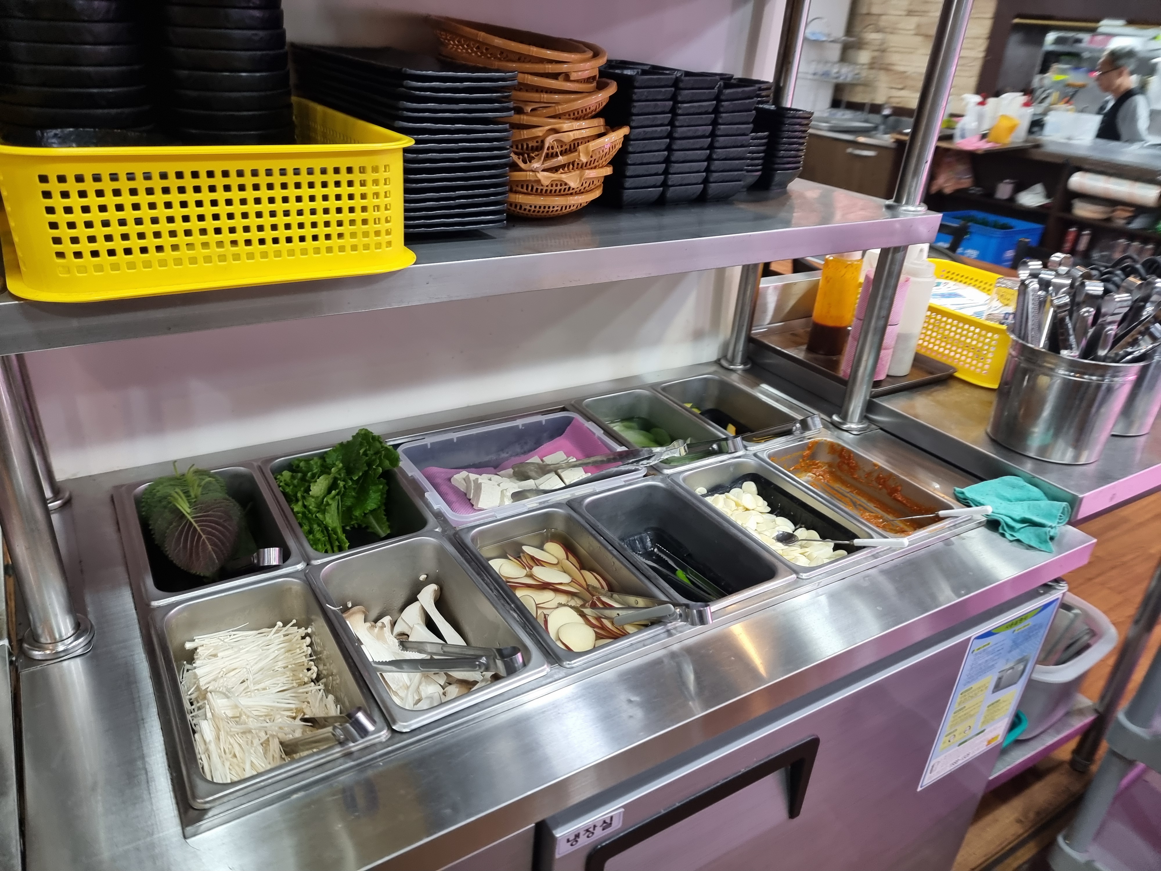 반찬들은 셀프로 가져다 먹을수가 있었다. 다양한 반찬이 준비되어 있었고, 냉장온도가  약 3도 정도 되는것 같이 느껴졌었다. 일부 반찬은 물에 담궈 놓았었고 일부 반찬은 반찬통에 담아놓았었다.