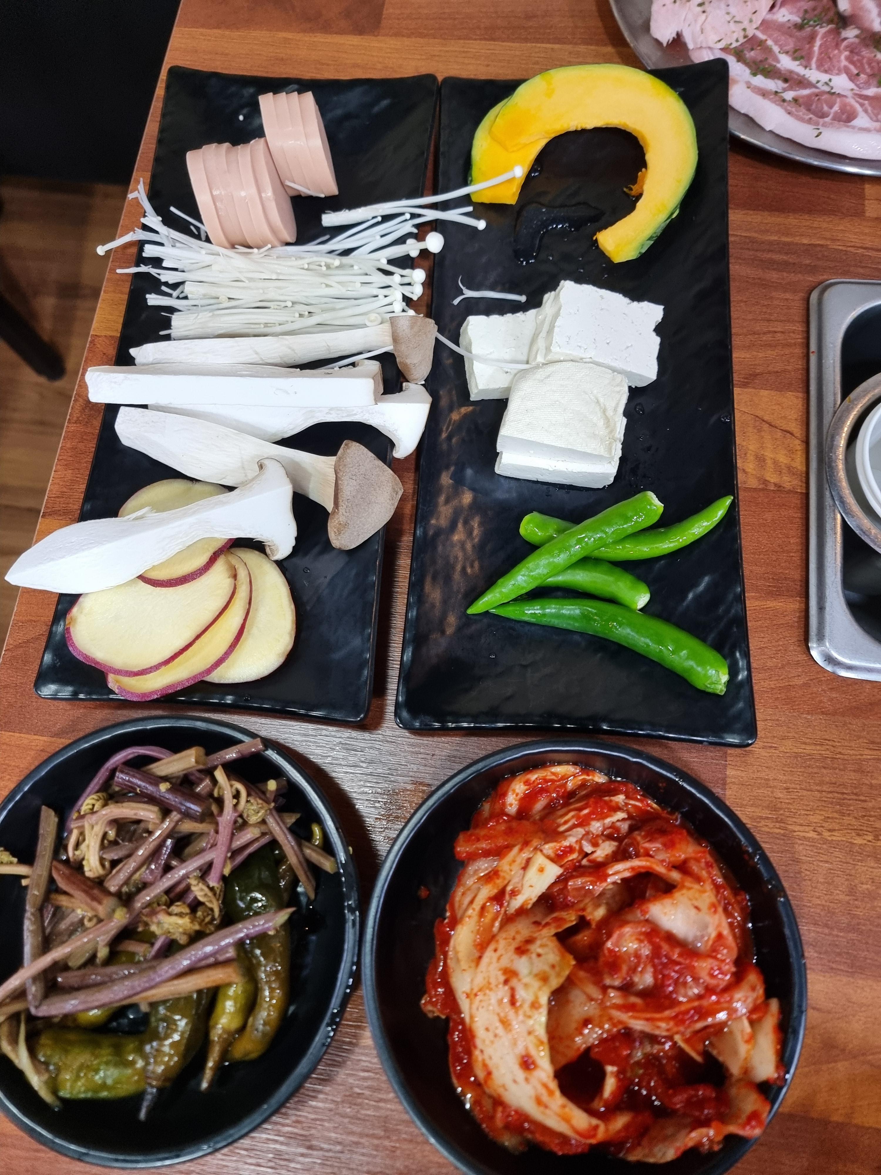 반찬 가지수가 다양하였다. 고사리, 김치, 마늘, 버섯, 호박, 소세지 등 다양한 반찬이 준비되어 있었다. 대부분 구워서 먹으면 맛있는 반찬이되는 반찬들로 구성하였다. 물론  고기기름에 잘 구워 고기와 야채를 볶아 먹어야 정말 맛있는 음식이 된다. 이게 진리가 아니겠는가. 음식점에서 준비한 셀프코너의 반찬과 야채의신선도도 상급이었다.