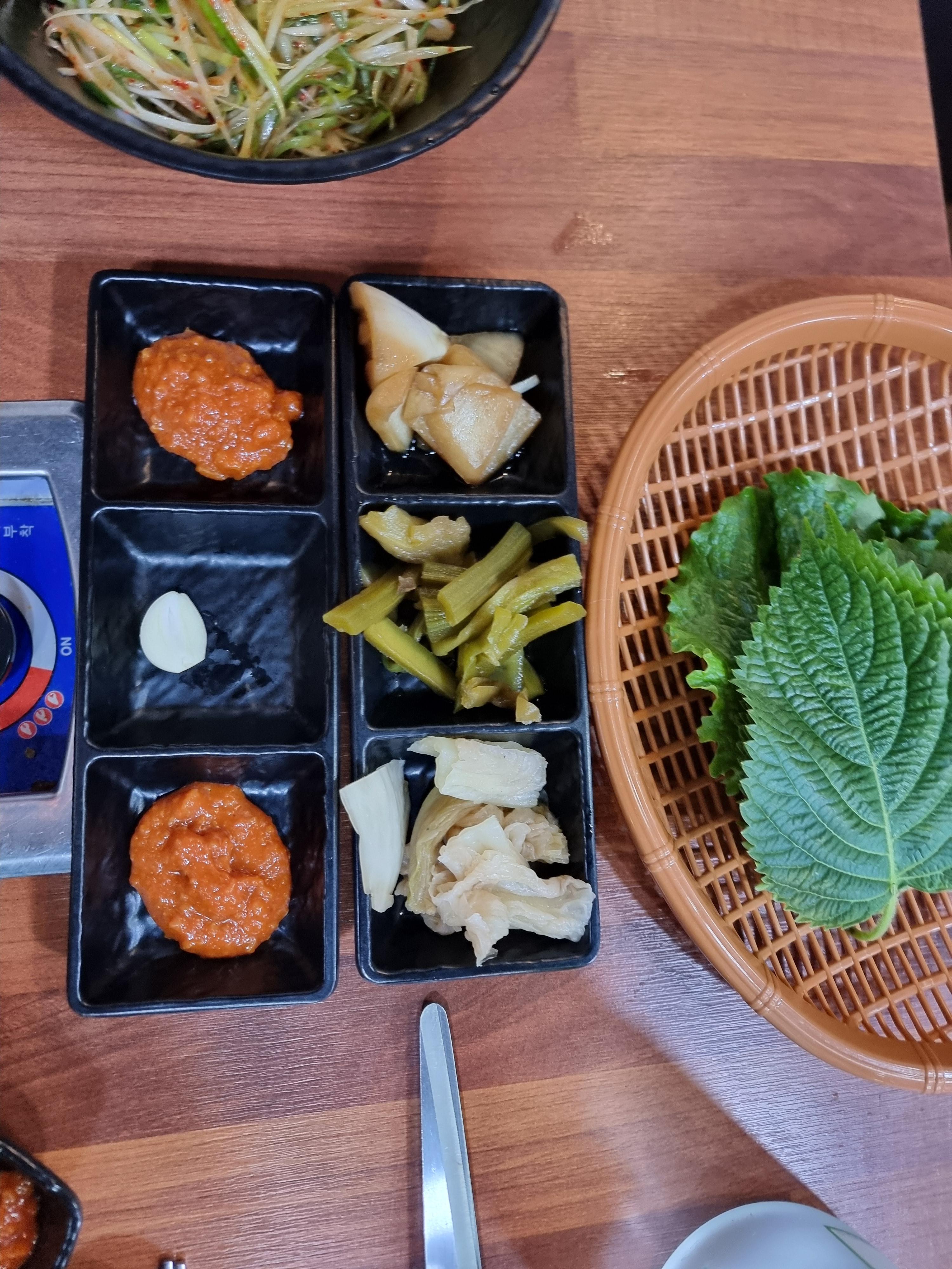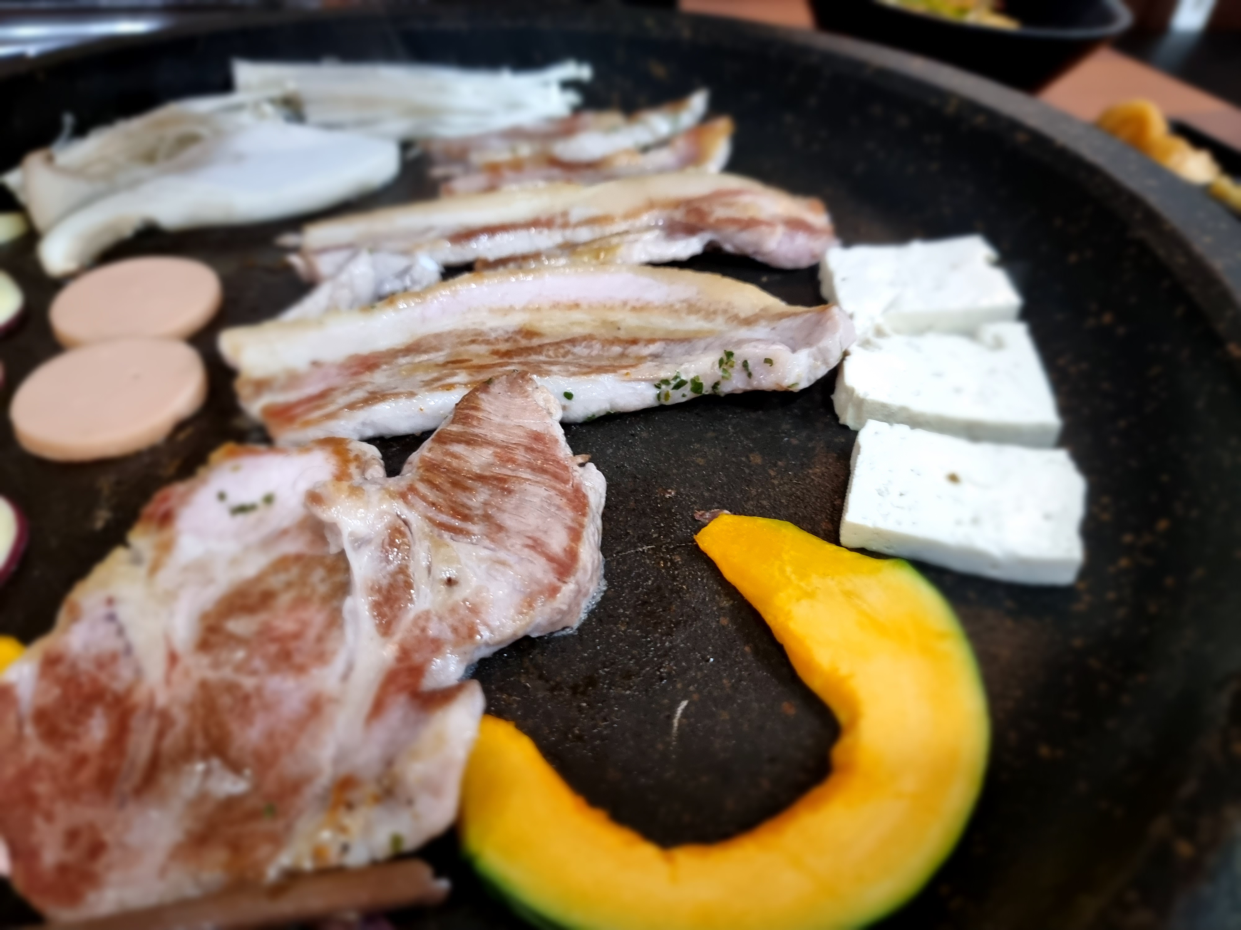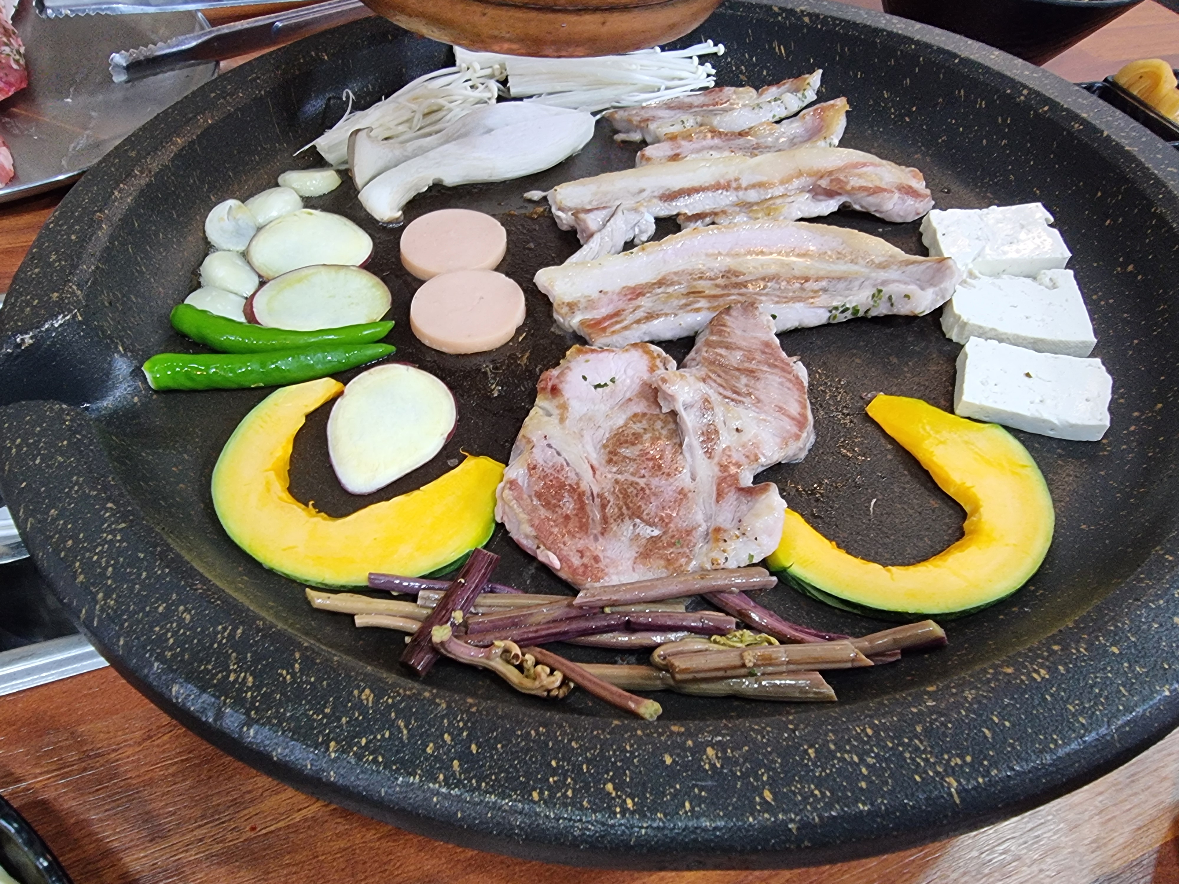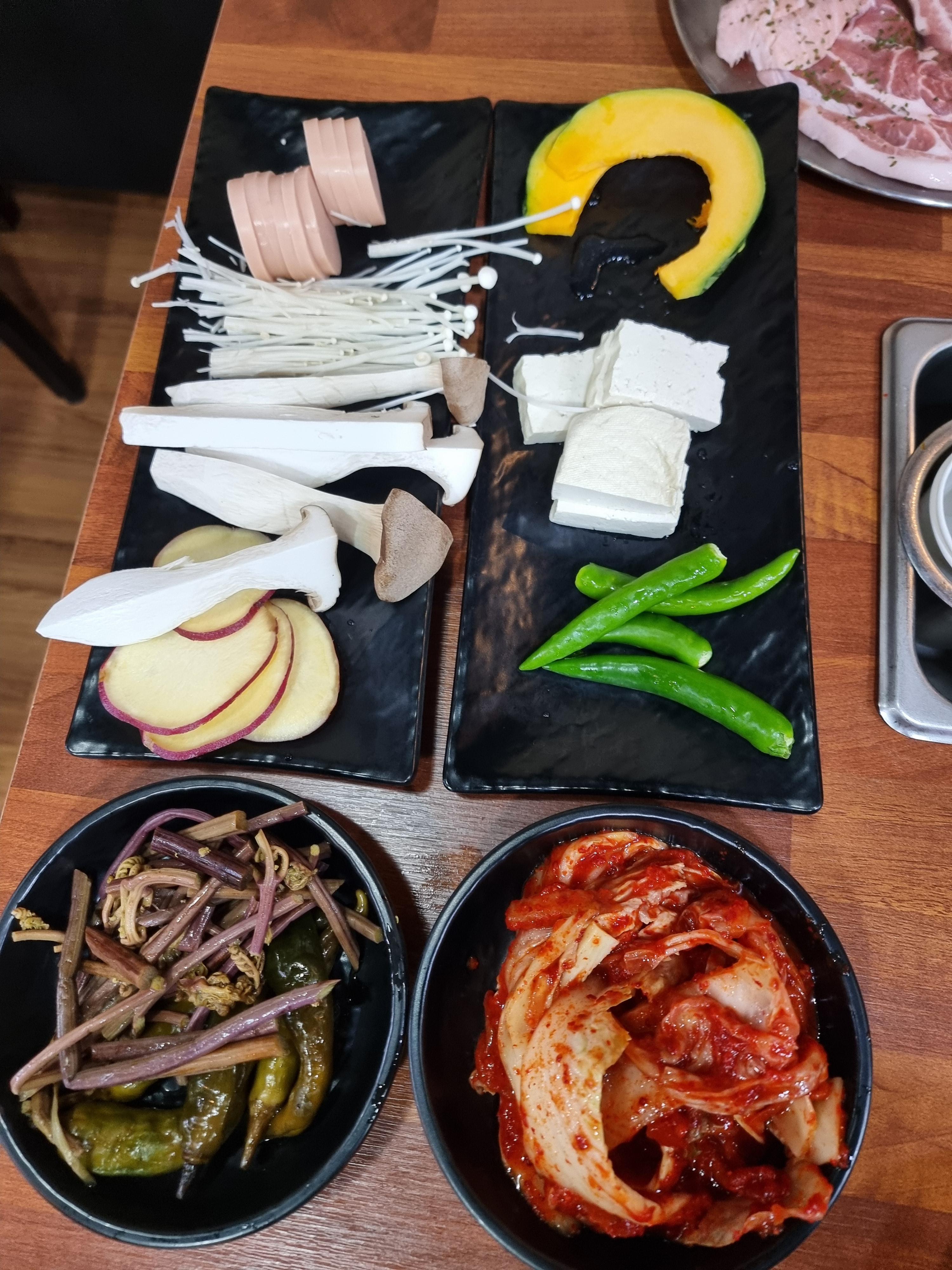 반찬 가지수가 다양하였다. 고사리, 김치, 마늘, 버섯, 호박, 소세지 등 다양한 반찬이 준비되어 있었다. 대부분 구워서 먹으면 맛있는 반찬이되는 반찬들로 구성하였다. 물론 고기기름에 잘 구워 고기와 야채를 볶아 먹어야 정말 맛있는 음식이 된다. 이게 진리가 아니겠는가. 음식점에서 준비한 셀프코너의 반찬과 야채의신선도도 상급이었다.