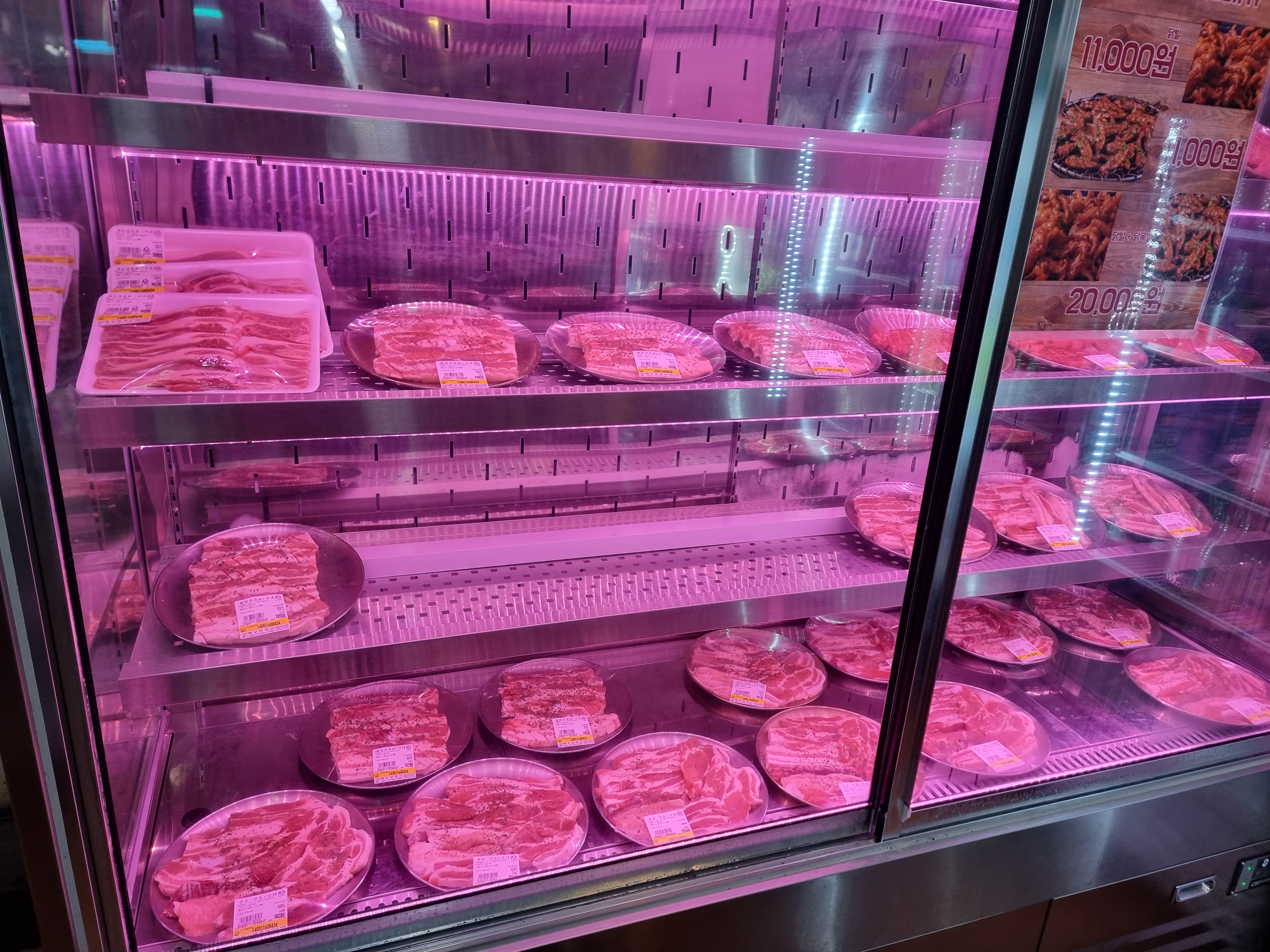 평일이라 사람들이 많이 없었지만 이미 몆 테이블에서 식사를 끝마친 직후에 들어갔다. 식당안에 들어오면 정육점에서만 볼법한 냉장고가 있었고, 이안에는 한돈과 한우가 정갈하게 놓여져 있었다.