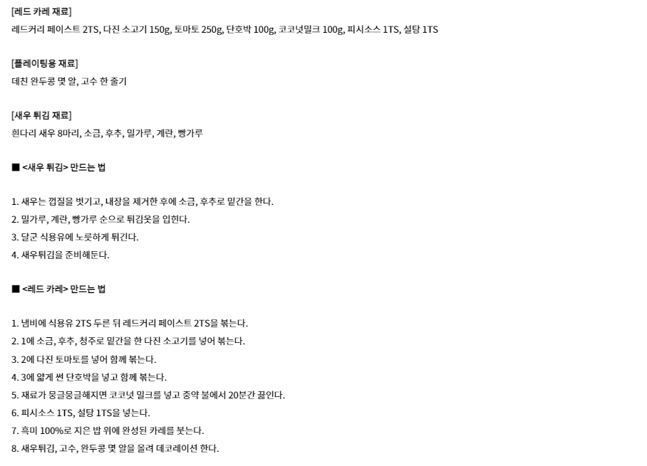 냄비에 식용유 2스푼을 두른 뒤 레드카레 페이스트 2스푼을 볶은 후, 소금, 후추, 청주로 간을 한 다음 소고기를 넣어 볶아준 후 토마토를 넣어 다시 한번 볶아준다. 볶는 시간은 3~4분 정도면 된다. 얇게 썬 단호박을 넣고 다시 한번 볶아주고 재료가 뭉치기 시작하면 코코넛 밀크를 넣고 중 약불에서 약 20~25분 정도 끓여준다. 피시소스 1스푼과 설탕 1스푼으로 1:1 비율로 섞어 소스를 넣어준다. 흑미 100%로 지은 밥 위에 카레를 붓고 새우티김과 고수, 완두콩 몇 알을 올려 데코레이션을 한다. 이렇게 하면 편스토랑 3 분 레드카페가 완성된다.