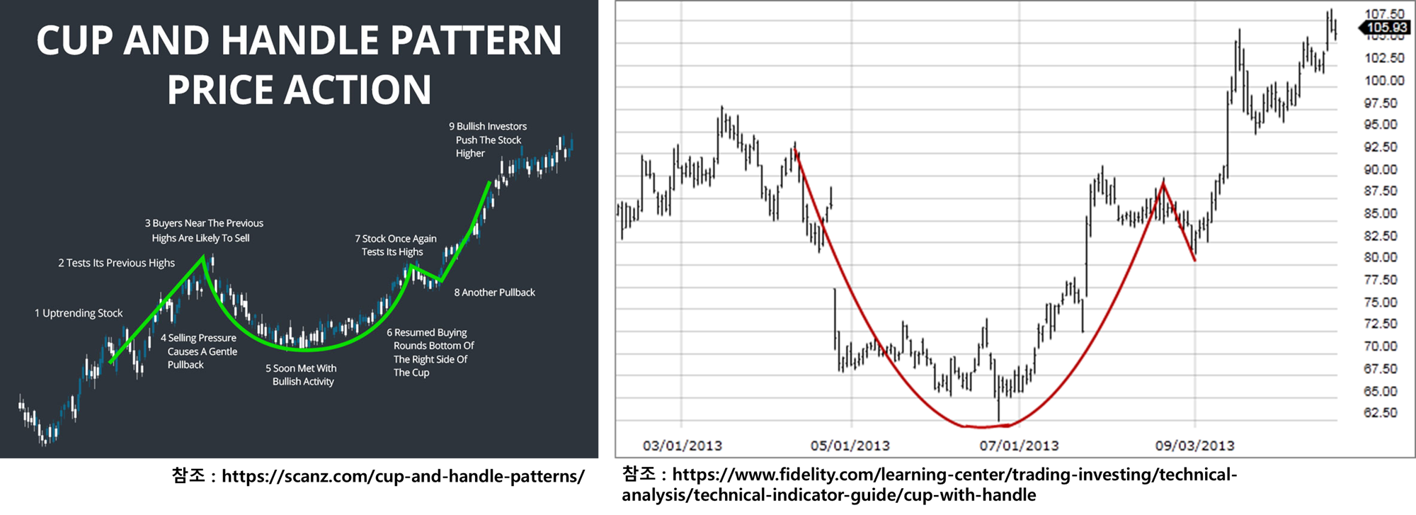 • 특징 : 상승추세에서 둥근 바닥과 그 후 작은 하락을 보이며, 이는 추가 상승을 예고 하는 주가패턴입니다. 보통 세력들이 물량을 매집하거나, 개미들을 공포에 몰아 놓을때 사용하기도 합니다.