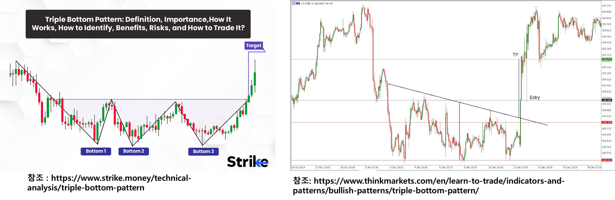 • 특징 : 트리플탑은 어원 그대로 세번의 고점으로 이루어져있으며, 이는 강력한 저항대가 형성되어 있음을 보여줍니다. 이또한 기간조정 이후 하락추세 전환을 의미합니다. 트리플 바텀은 세번의 저점으로 구성되어 있으며, 강한 지지대가 형성되어 있음을 보여주며, 하락추세가 종료 되었음을 보여주는 주가패턴으로 알려져 있습니다.