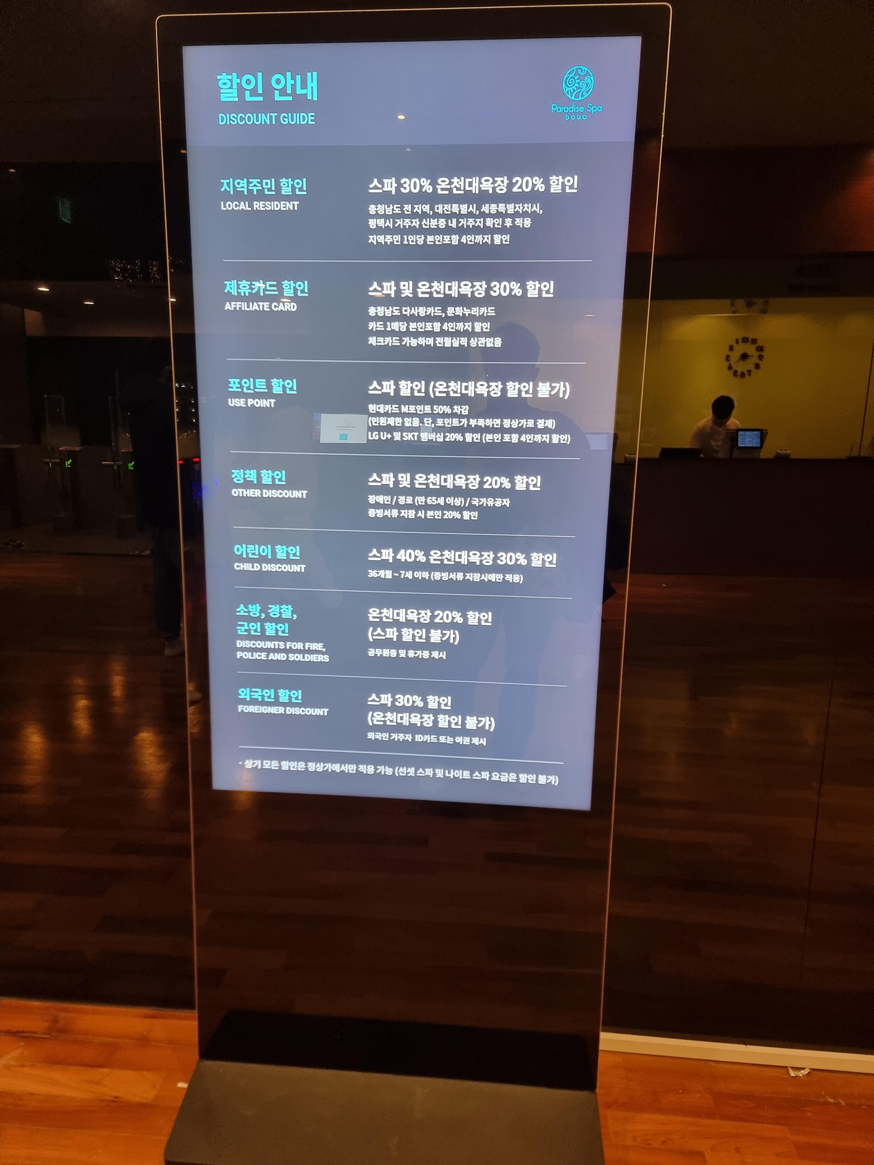 각종 할인도 있는데, 인터넷 예매를 하면 더 저렴하게 사용할 수 있다. 네이버 예매는 종일권 기준으로 1인 41000원에 판매되고 있고, 3인 기준 114500원으로 구매할 수 있다. 현장예매 구매 시에 적용되는 통신사 할인 혜택이 있는데, LG U+ , SKtelecom 은 현장에서 20% 할인해 준다. 7세 이하는 40%까지 DC를 해준다고 하니, 어린아이들이 있다면 파라다이스 스파 도고에 가족끼리 놀러 가는 것도 괜찮아 보인다.