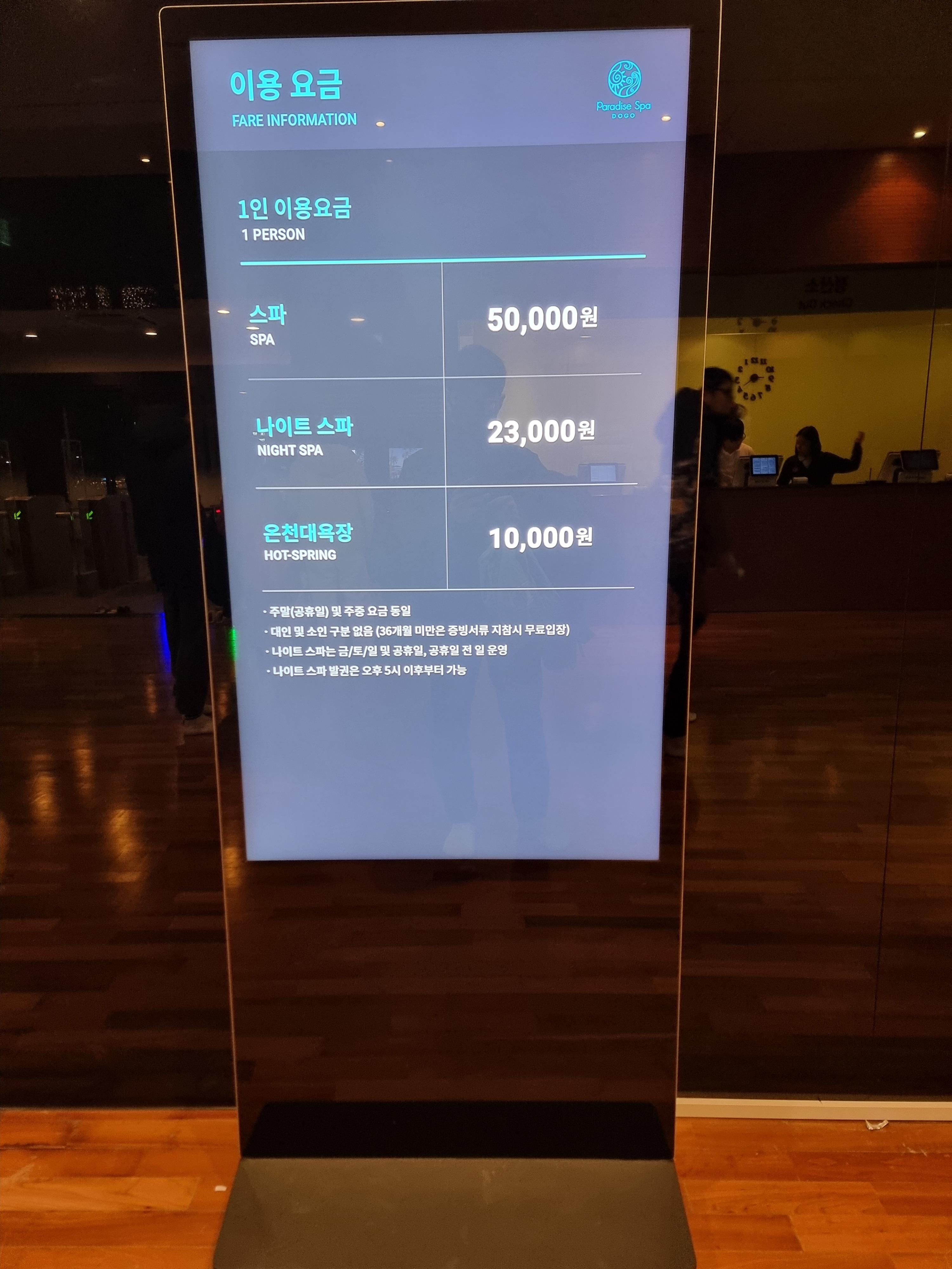 스파는 50000원, 나이트스파는 23000원, 온천탕은 10000원 이었다.