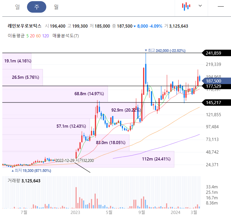 일봉을 보시면 아주 자연스럽게 187500원 매물대를 4번정도 터치하다가 5번째에 뚫고 올라갔죠. 그리고 어제 비석캔들이 나오면서 일단 조정이 마무리 된것처럼 보입니다. 이번 상승에 21만원을 1번 더 터치를 해줄지 24만원으로 곧장 올라갈지는 두고봐야 알겠지만, 레인보우로보틱스에 다들 알고 있지만 공식적으로 공개하지 않은 재료들이 몇개 정도가 있잖아요?