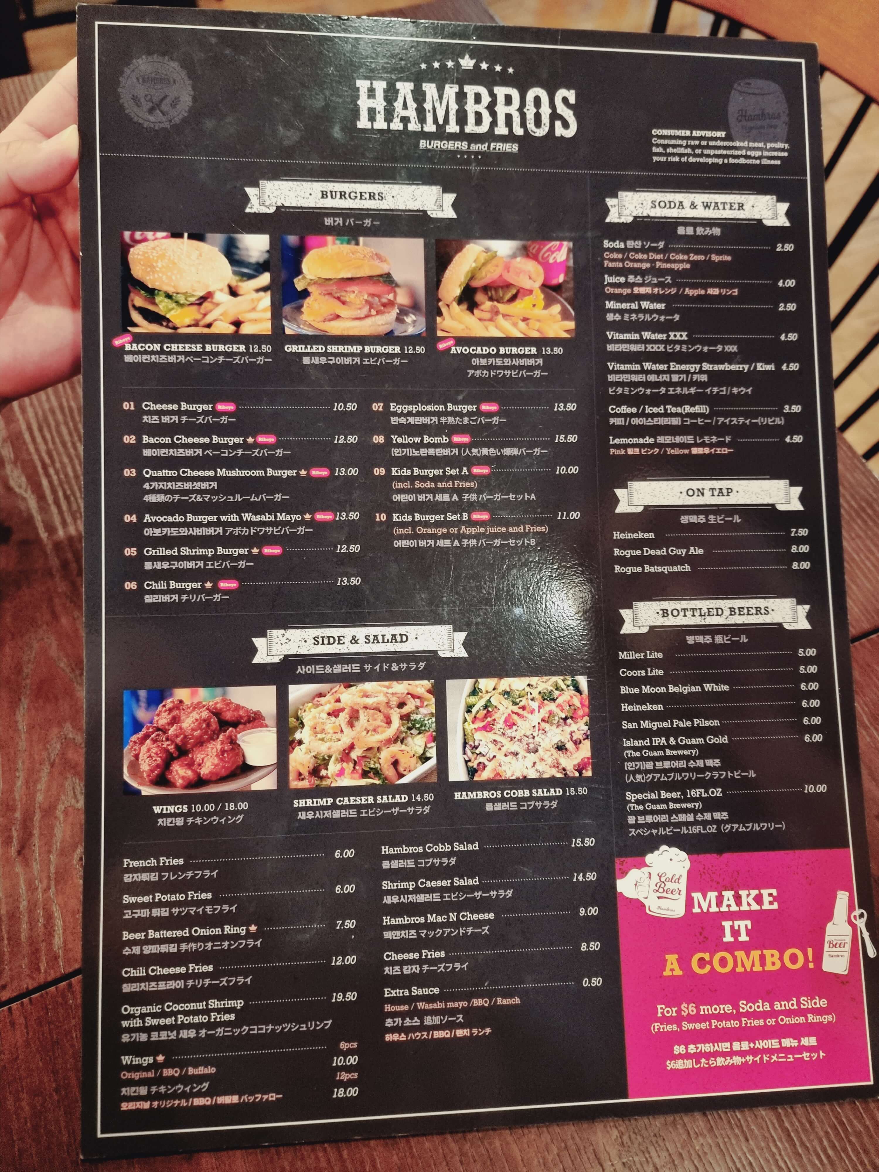 다행히 한국인이나 일본인이라 판단되면 홀 매니저분이 한국어로 된 메뉴를 전달해 주신다. 부담 없이 햄버거와 사이드메뉴에 대해서 손쉽게 주문을 할 수 있었다. 주문 시 추천메뉴를 문의드리면, 직원들이 만들고 나서 맛있다고 한 메뉴를 추천해 주니, 주문할 때 참고하시면 될 것 같다.