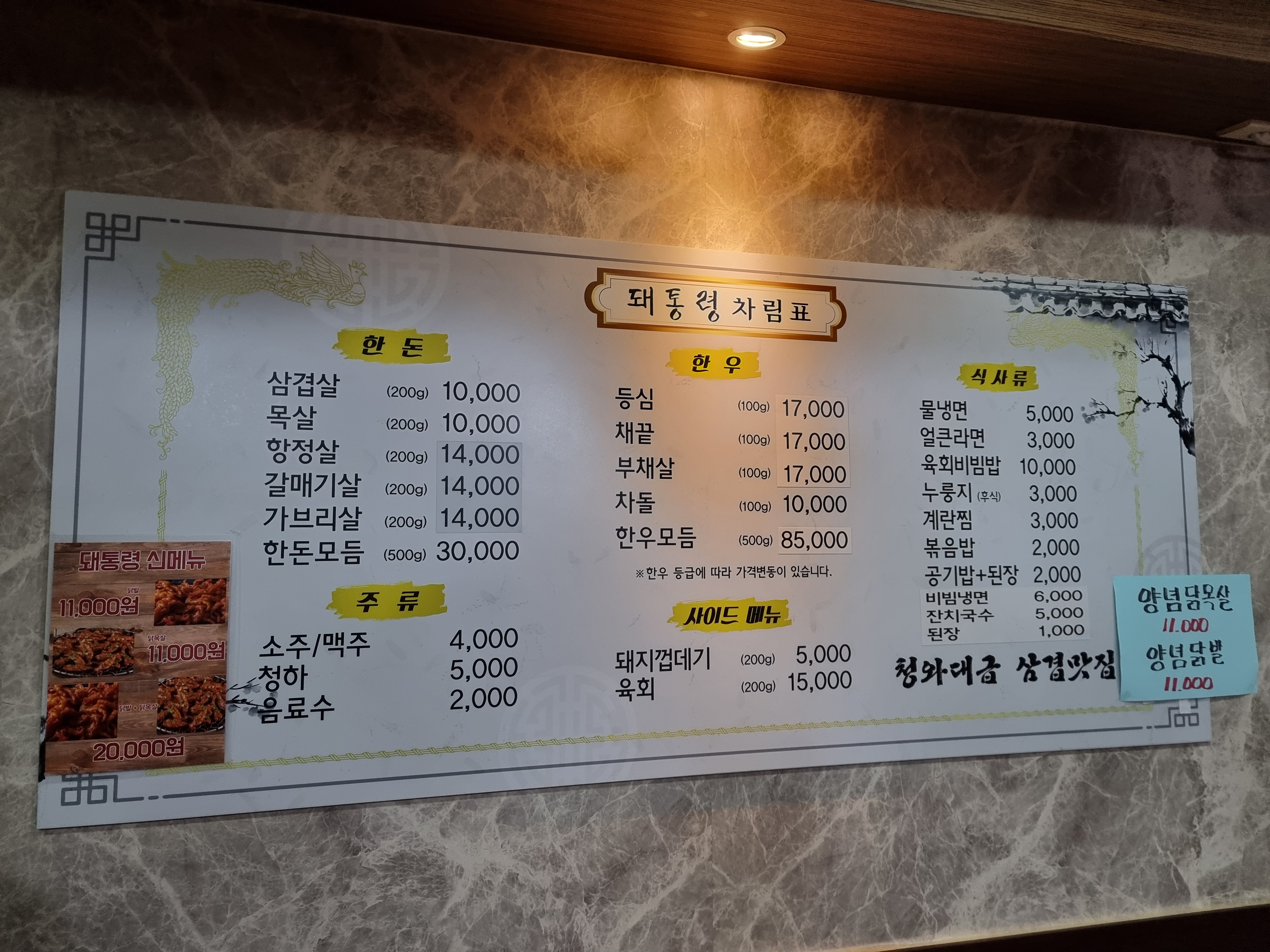 대전 유성구 정육점직영 돼지고기 음식점을 찾다가 맥우방돼통령이라는 음식점을 알게 되었다. 동네에 맥우방 돼통령에서 돼지고기 오겹살을 샀었는데, 매우 맛있었어서 서치를 하다가 가성비가 좋다는 정육점직영식당인 맥우방돼통령을 발견했다. 주 메뉴는 한돈과 한우를 판매하였는데, 한돈은 삼겹살, 목살, 항정살 등 사람들이 좋아하는 부위로 판매가 되고, 한우는 맛있는 부위로 판매가 되고 있었다. 특수부위가 있으면 더 좋았을 것 같았는데, 특수부위는 판매하지 않는 것 같았다.