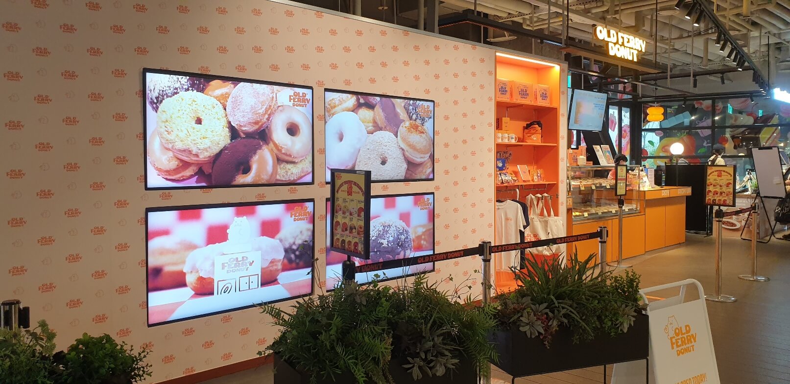 아이파크몰 4층에 있는 OLD FERRY DONUT은 매장 입구가 도넛을 먹고 싶게 만드는 색감으로 구성되어 있었다. 입구에는 알력 잘록한 벽이 구성되어 있었고, 이 벽 앞쪽으론 디스플레이를 위한 모니터 4대가 벽에 함몰되어 도넛을 파는 가게라는 것을 한눈에 알 수 있었다. 내부는 우드톤보다 밝은 주황색과 노란색계열을 섞어서 도넛을 색깔로 형상화하였다.